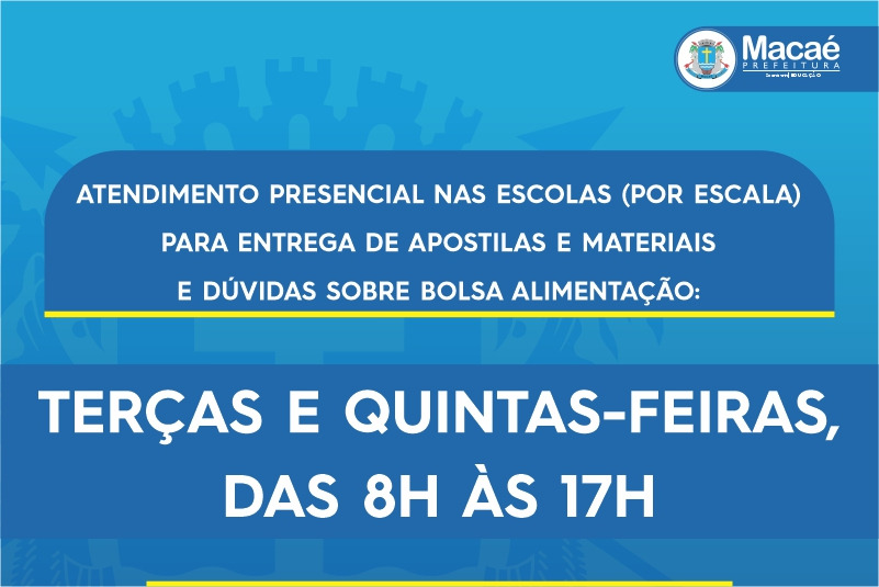 A Secretaria Municipal de Educação da Prefeitura de Macaé informa que pais e responsáveis podem procurar as escolas municipais às terças e quintas, das 8h às 17h, para receber atendimento específico do Bolsa Alimentação, além de atividades impressas e ou kit pedagógico. A entrega destes materiais será de forma escalonada por ano de escolaridade. Neste momento, a distribuição irá priorizar alunos que não possuem conectividade, ou seja, acesso à internet.