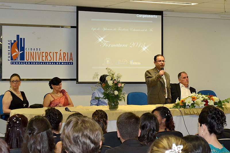 Representando o prefeito Dr. Aluízio, o presidente da Funemac, professor Alexandre de Azevedo, compôs a mesa junto com o vereador Marcel Silvano, representante da Câmara Municipal; o superintendente Acadêmico da fundação, professor Sérgio Netto; a diretora geral do CAp, Wanessa Leal; a vice-diretora, Sueli Silva dos Santos; e as professoras paraninfas das turmas, Michele Fonseca e Maria Francisca da Rocha Manhães.