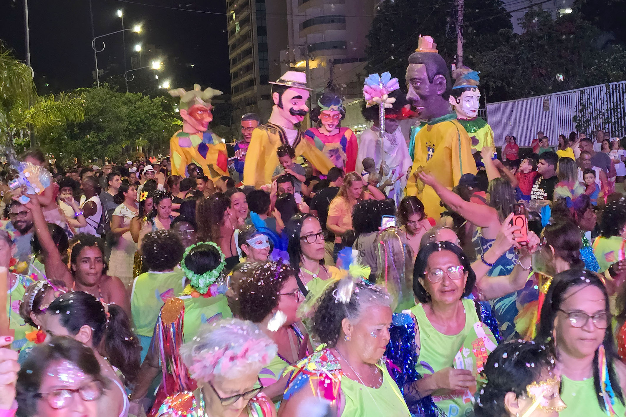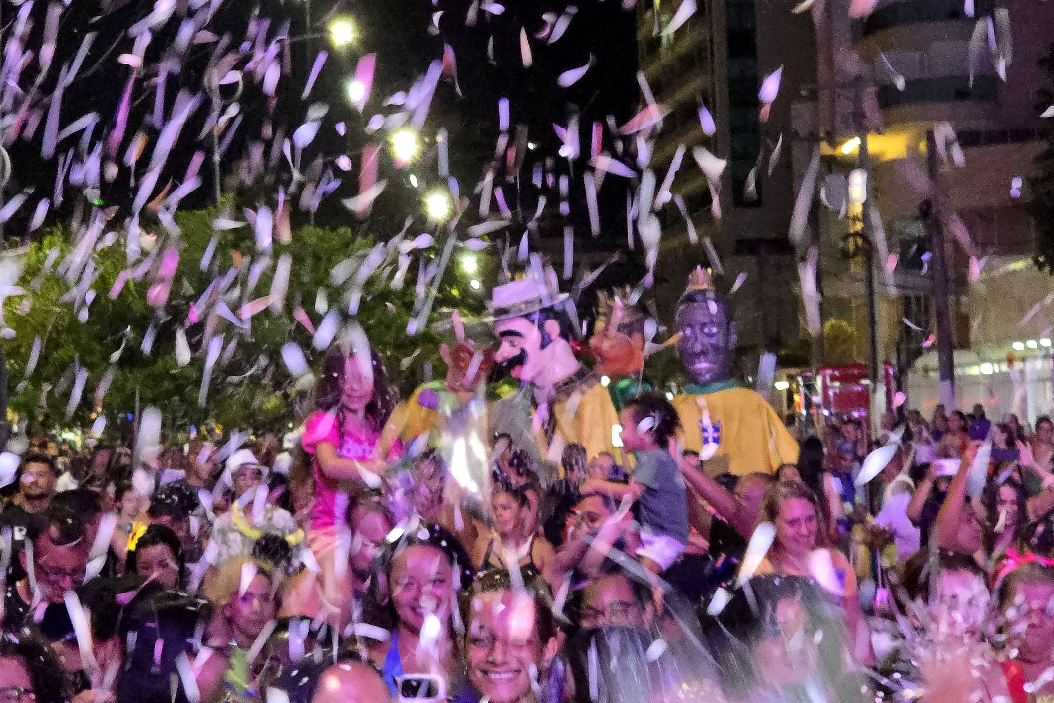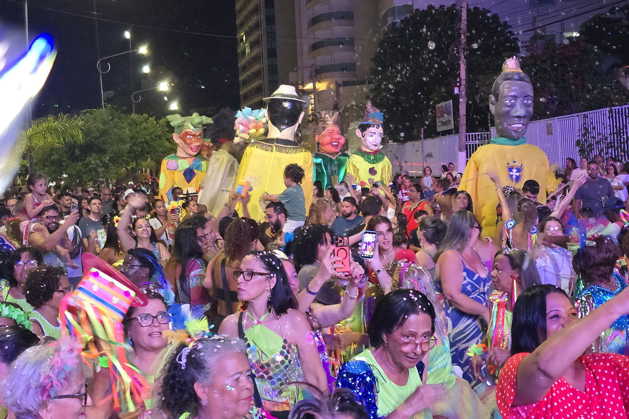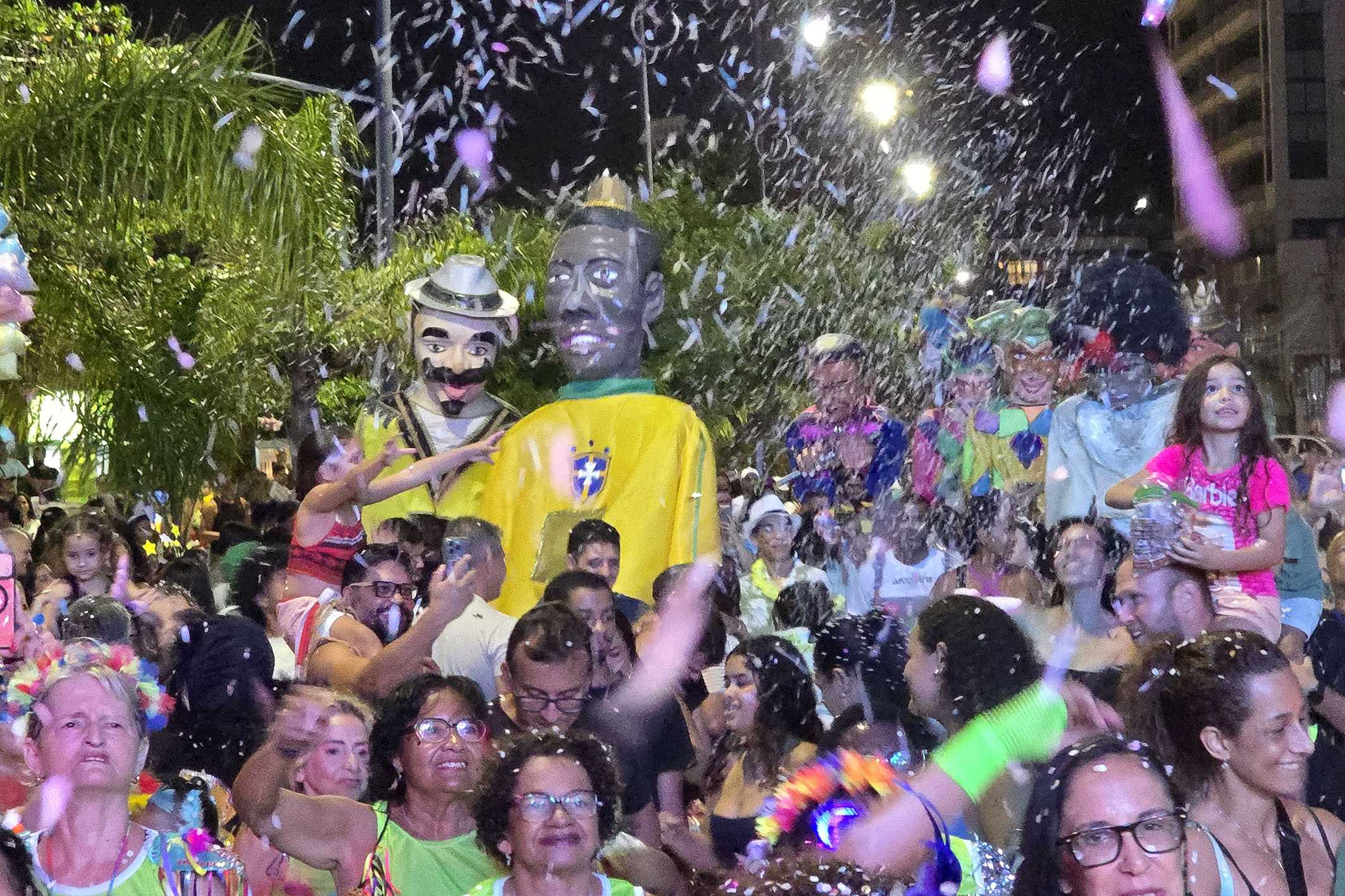 A área da Imbetiba, próxima ao anfiteatro, recebeu o cortejo dos bonecos gigantes, que encantaram a plateia e transformaram o espaço em um verdadeiro espetáculo a céu aberto. Entre registros fotográficos e aplausos, os personagens desfilaram em meio à multidão, ampliando o clima lúdico e festivo da noite. O espaço também contou com o talento do tradicional Bloco do Benê, que trouxe o espírito dos antigos bailes carnavalescos por meio das marchinhas que atravessam gerações. Com fantasias cheias de brilho, paetês, glitter e criatividade, famílias e amigos celebraram o Carnaval em um ambiente de leveza e alegria coletiva. Entre elas estava a educadora Ana Aguiar. “Tudo aqui está lindo. A Imbetiba é um cenário perfeito para o Carnaval. Temos boas memórias e o clima aqui é leve e animado.”
