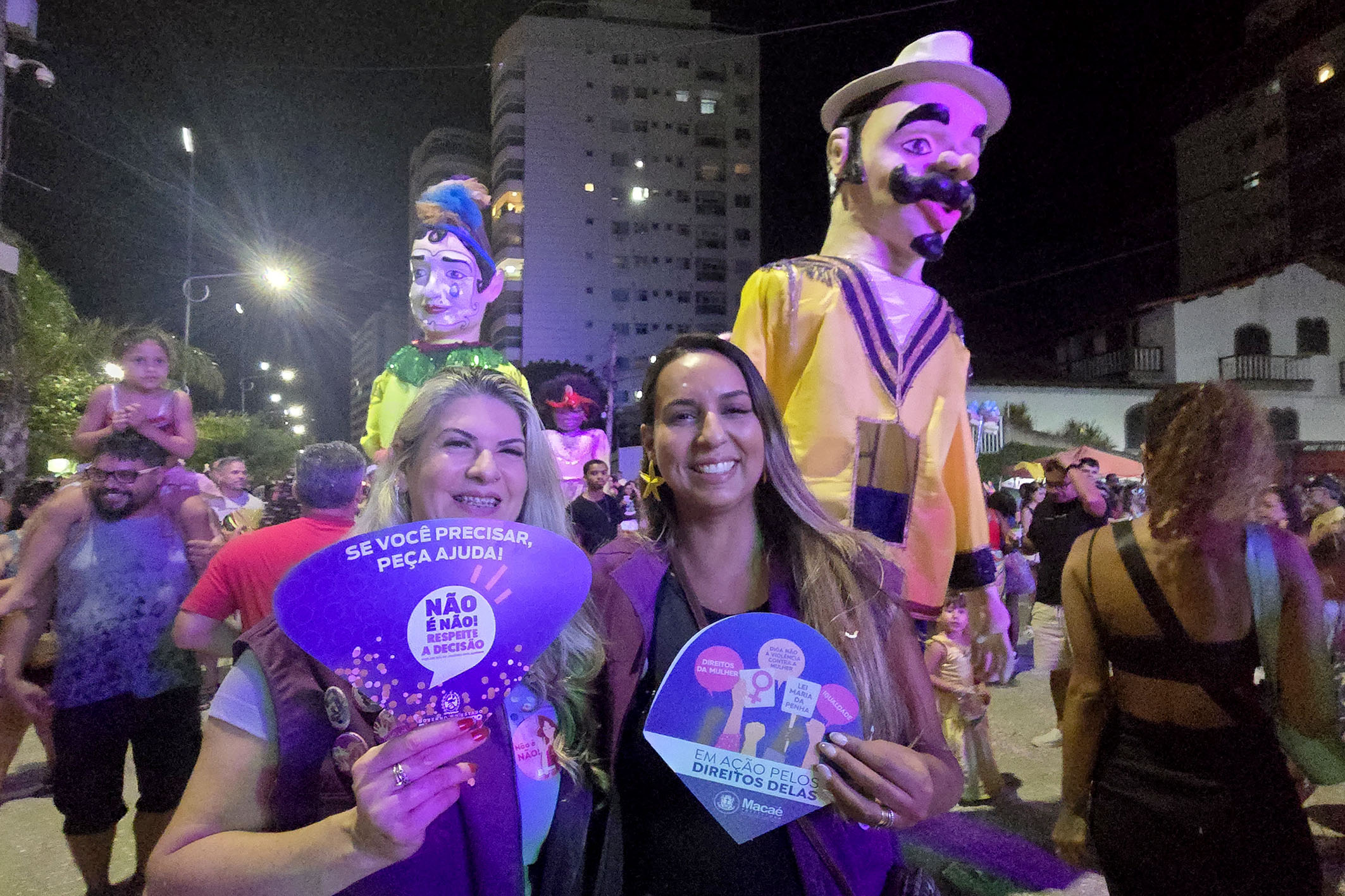 Também na Imbetiba, o público recebeu materiais informativos, como leques com mensagens que reforçam que “Carnaval é festa. Respeito é regra”, destacando o compromisso permanente com a proteção das mulheres. A iniciativa integra a campanha “Não é Não”, voltada à prevenção e ao enfrentamento do assédio e da violência contra meninas e mulheres durante o período de folia.