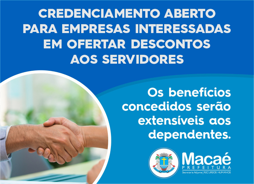A Prefeitura de Macaé, por meio da Secretaria Municipal Adjunta de Recursos Humanos, abriu chamamento público nº 007/2022 para credenciar pessoas jurídicas interessadas na concessão de descontos atrativos nos serviços prestados ou fornecimento de bens, beneficiando os servidores da prefeitura extensivo aos dependentes.