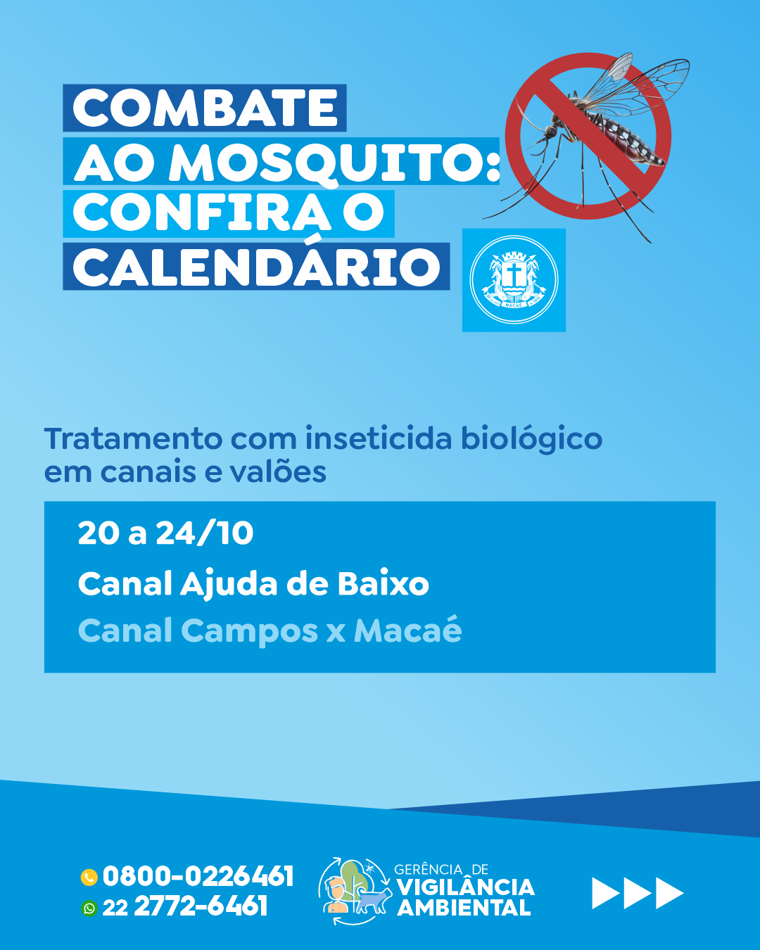 Nos dias entre 20 e 24 de outubro, será feito o controle do mosquito Culex, popularmente conhecido como pernilongo, em duas regiões da cidade: Canal Campos Macaé, Canal Ajuda de Baixo. Será realizado tratamento com inseticida biológico.