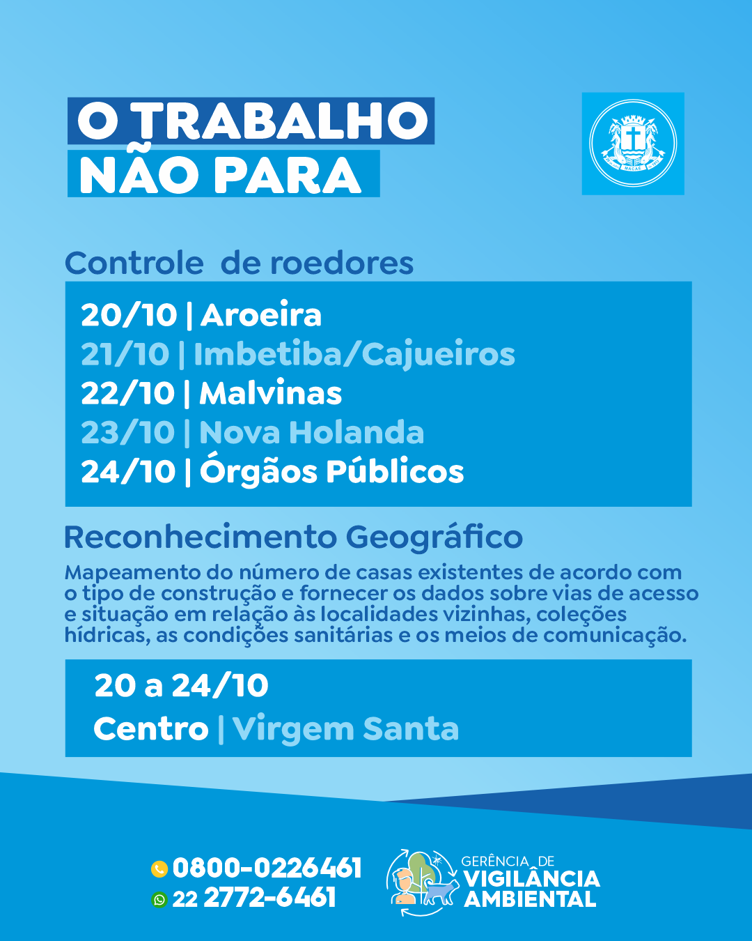 As ações incluem também visitas em pontos estratégicos como empresas, borracharias, ferros velhos e órgãos públicos. A equipe estará entre os dias 20 e 24 nos bairros Lagomar, Engenho da Praia, Botafogo, Barra de Macaé e Cabiúnas. Já a atualização do reconhecimento geográfico se concentrará no Centro e na Virgem Santa.