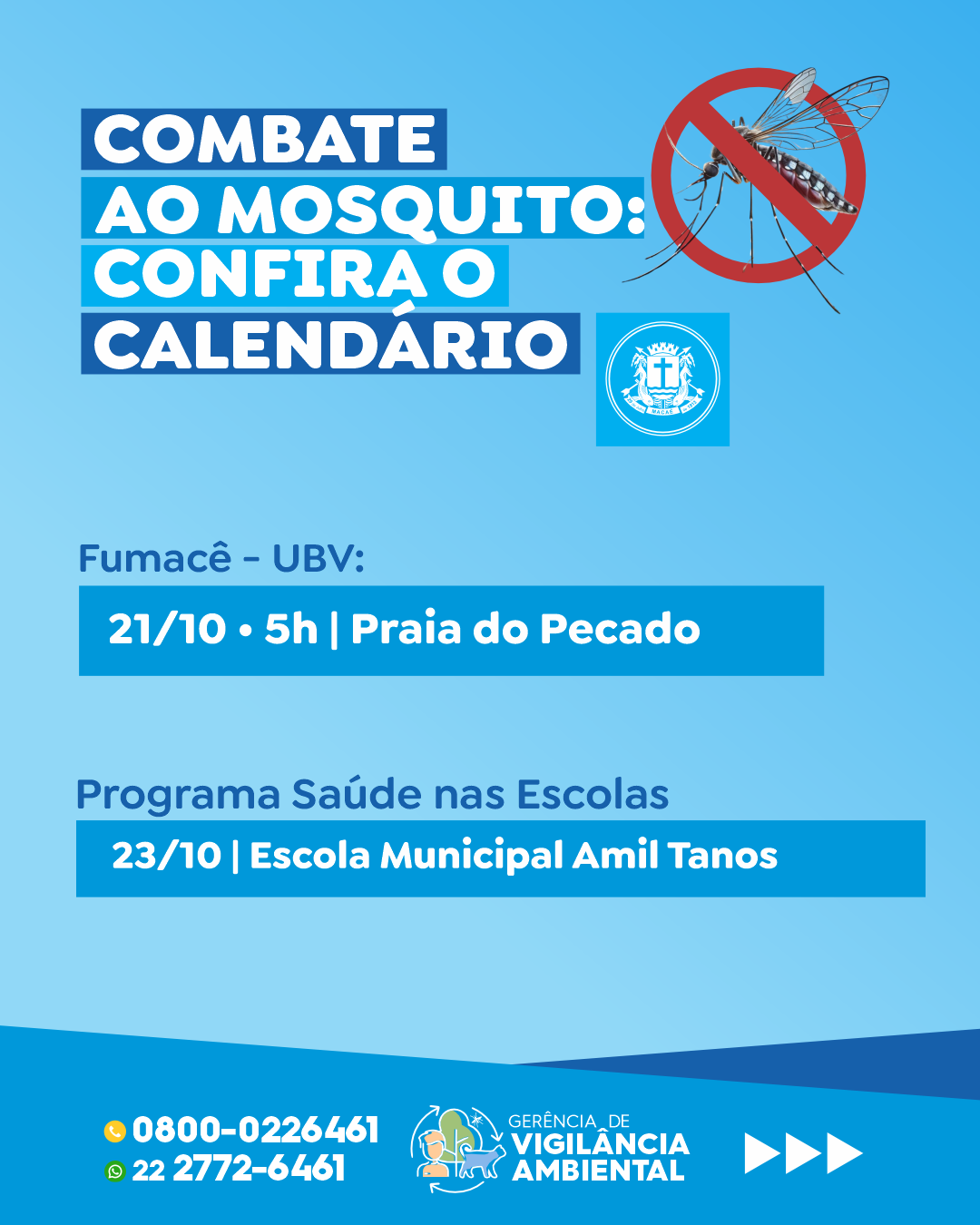 Para solicitações e denúncias, a população pode entrar em contato com a Gerência de Vigilância Ambiental, que funciona à Rua Vereador Manoel Braga, 425, Centro de Macaé, ou através do e-mail cevas@macae.rj.gov.br ou, ainda, pelo Disque Dengue (0800-022-6461), com ligação gratuita, e o WhatsApp Aedes (22) 2772-6461.