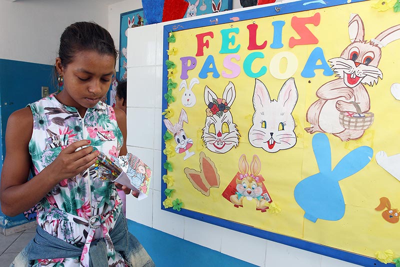 Moradora da Nova Holanda, Lorrayne foi uma das participantes da festinha de comemoração à Páscoa, que aconteceu na unidade, nesta quarta-feira (12). “Gosto de vir todo dia para cá para brincar, pintar, desenhar, fazer artesanato”, comenta a menina que estuda no oitavo ano do Colégio Municipal Professor Samuel Brust, enquanto mostra os desenhos pintados por ela e também o artesanato feito com caixa de leite.