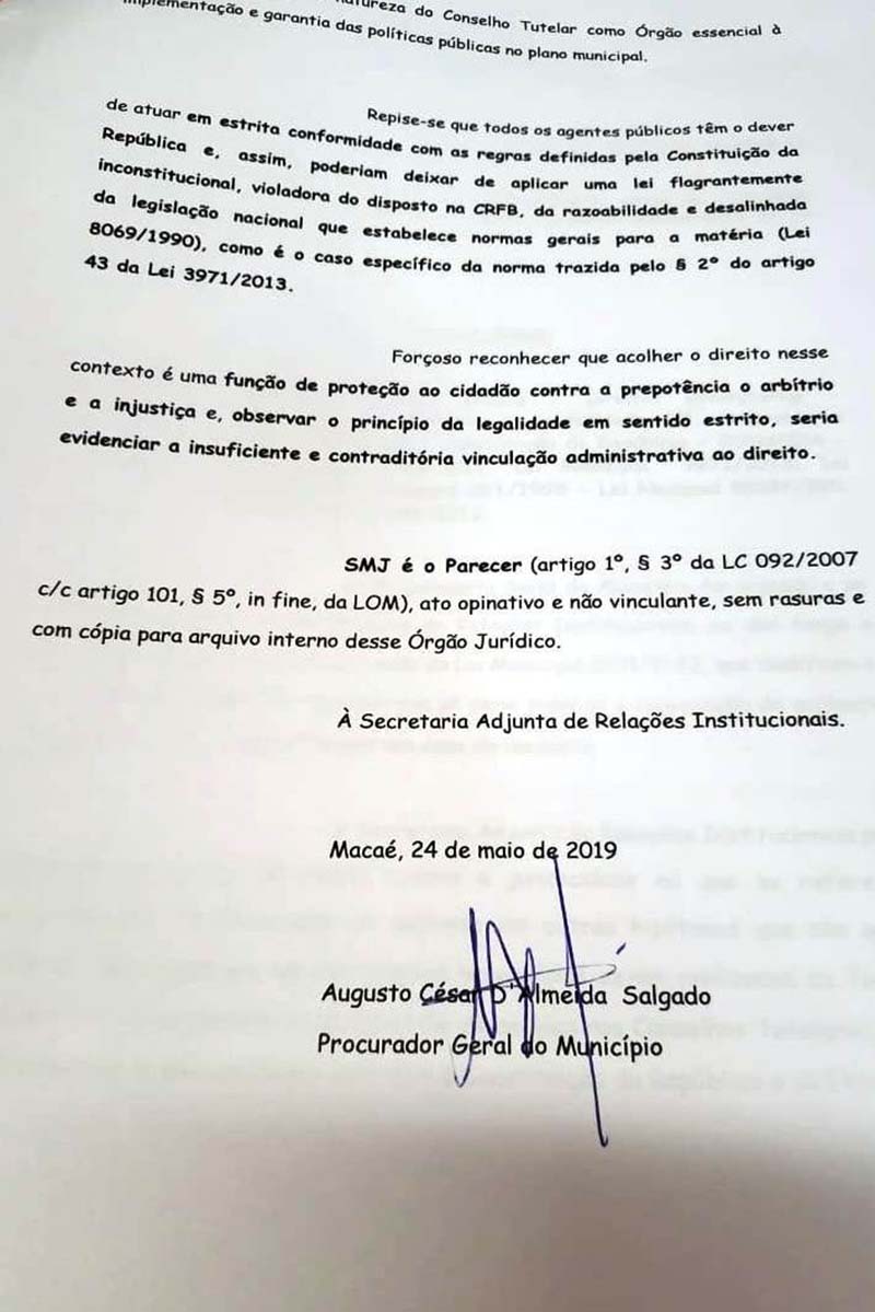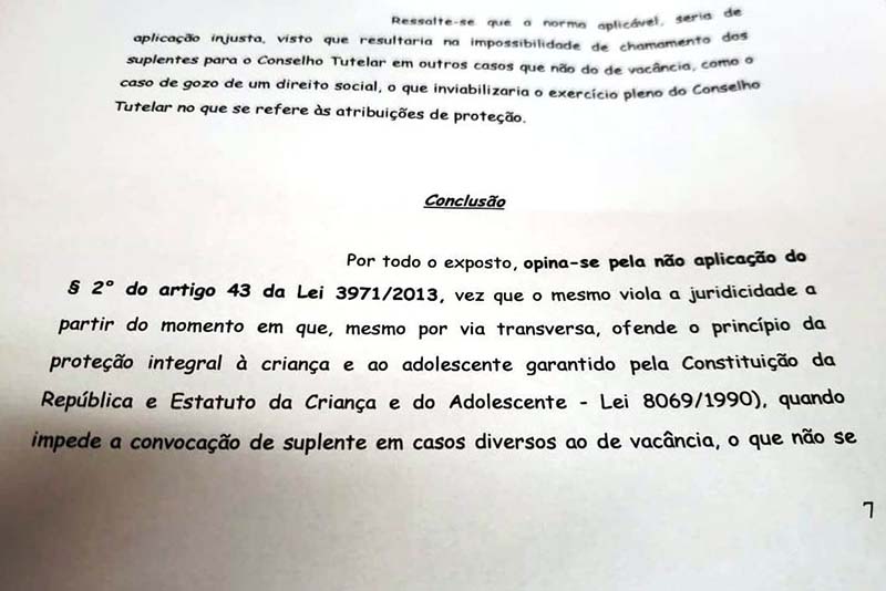No despacho, a Procuradoria aponta entendimento de não aplicação do artigo 43 da lei complementar 3.971/2013, que versa sobre a convocação de suplentes apenas em caso de vacância. Segundo a análise, essa determinação está em desacordo com os princípios do Estatuto da Criança e do Adolescente (ECA).