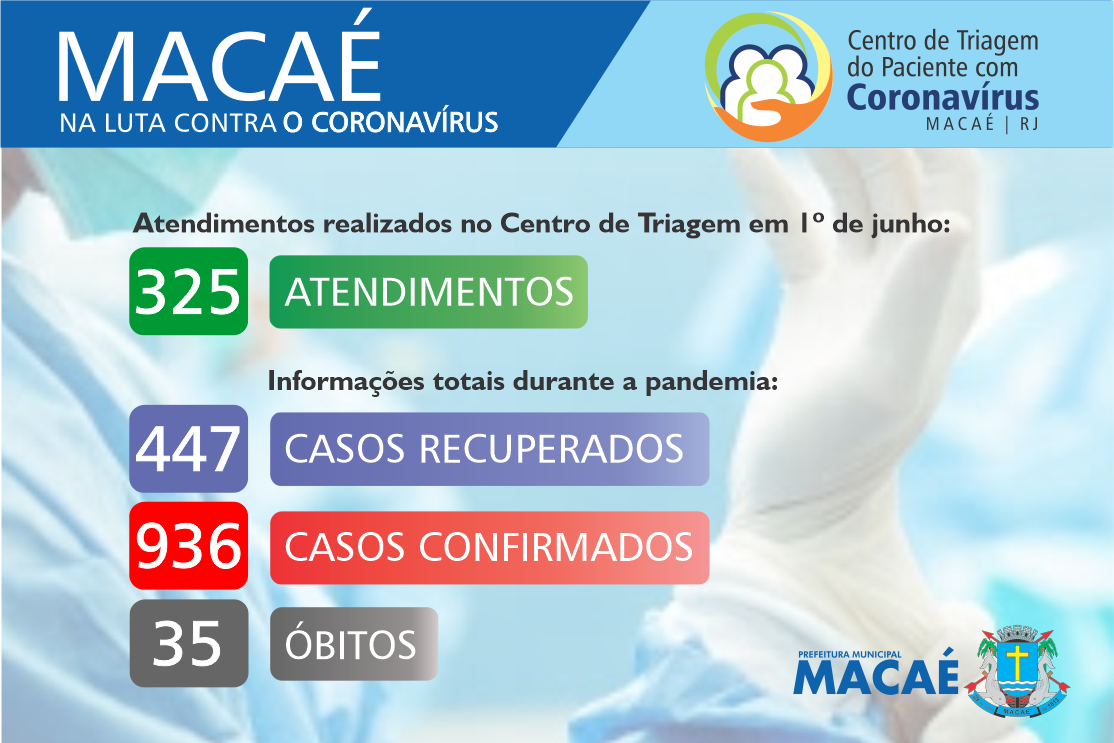 O Centro de Triagem do Paciente com Coronavírus de Macaé realizou, durante as 24 horas do dia 1 de junho, 325 atendimentos. O município tem 936 casos de coronavírus confirmados, sendo 447 pacientes recuperados e mais dois óbitos. Sendo assim a cidade contabiliza 35 óbitos por Covid-19.