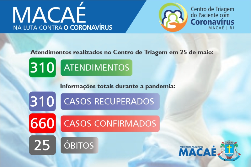 O Centro de Triagem do Paciente com Coronavírus de Macaé realizou, durante as 24 horas do dia 25 de maio, 310 atendimentos. O município tem 660 casos de coronavírus confirmados, sendo 310 pacientes recuperados e 25 óbitos.