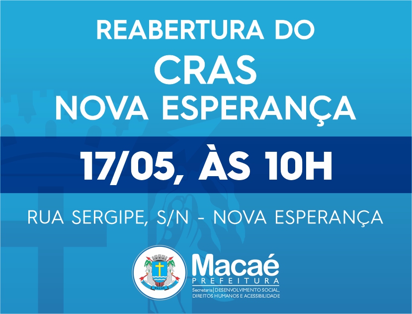 O Centro de Referência de Assistência Social (Cras) da Nova Esperança será reaberto nesta terça-feira (17), às 10h. A unidade de proteção social básica é gerida pela Prefeitura de Macaé, por meio da Secretaria de Desenvolvimento Social, Direitos Humanos e Acessibilidade.