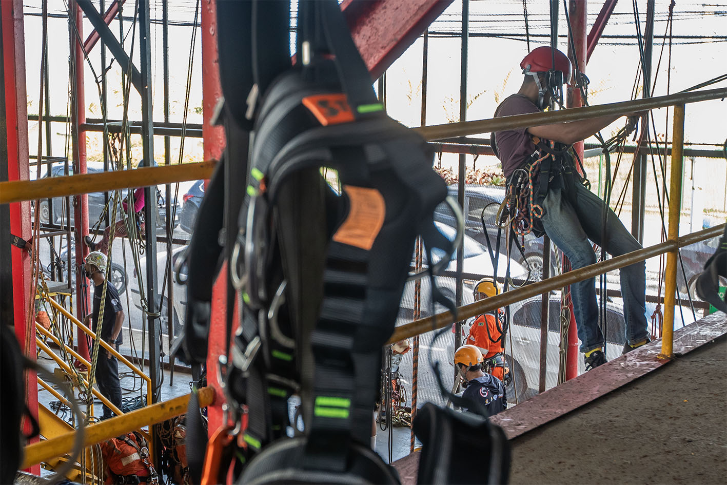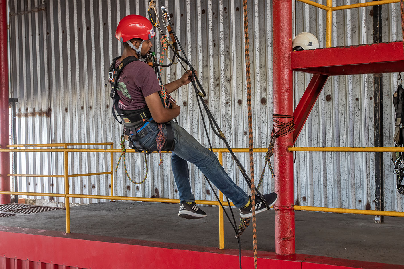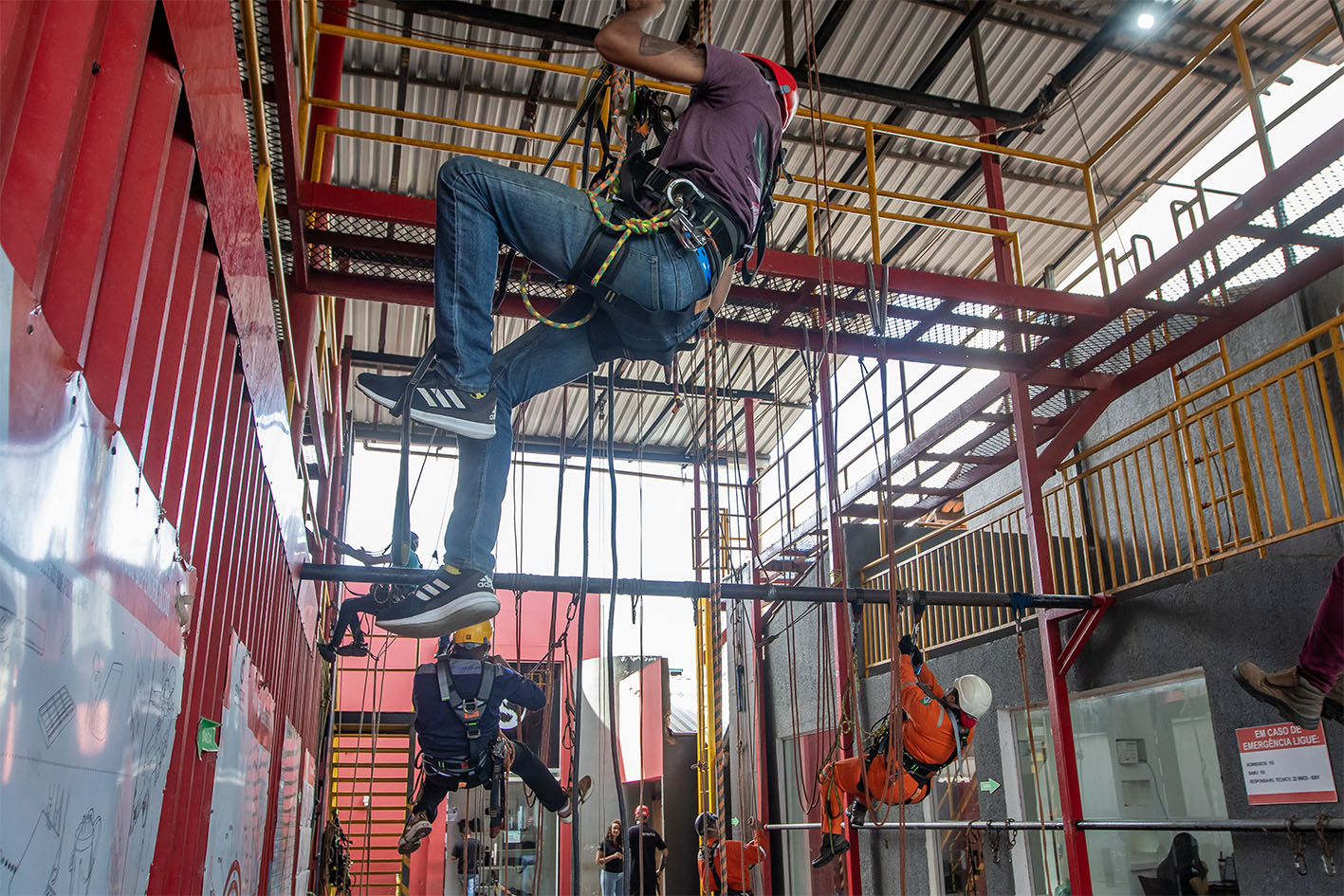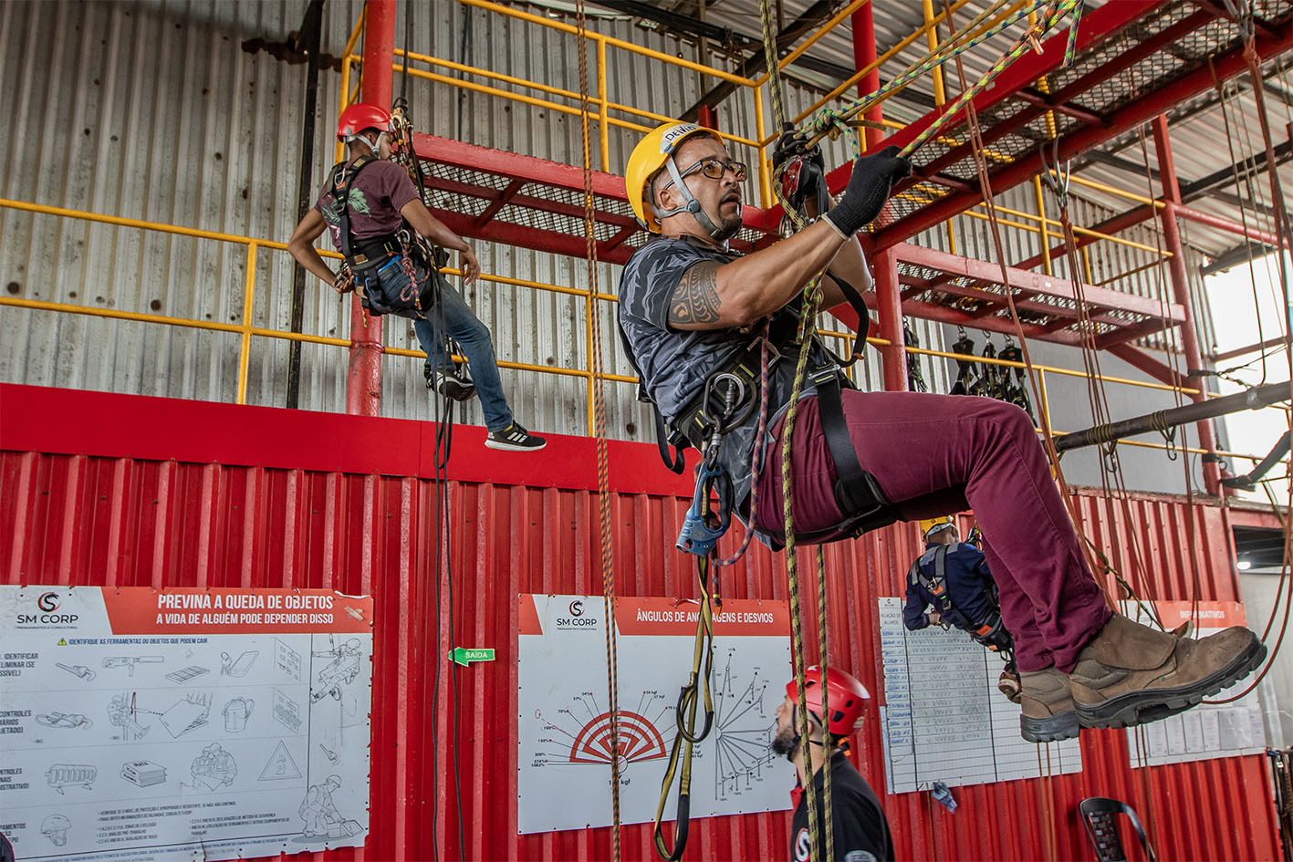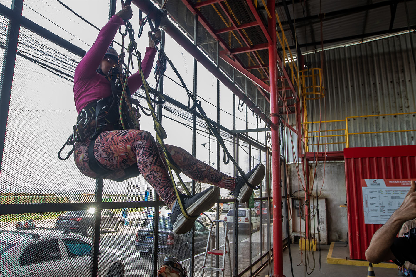 Cordas, mosquetões e equipamentos de proteção individual fazem parte das aulas práticas do curso de Acesso por Cordas. A turma Nível 1 (N1) também é inclusiva e conta com muita coragem e vontade de vencer. Diante das aulas teóricas e práticas, que abrangem conhecimentos básicos de normas, habilidade e concentração, os alunos aprendem tarefas em altura sob supervisão, montar sistemas de acesso, realizar resgates e trabalhos com cordas de forma segura e a utilizar equipamentos. Deivid Correa, de 40 anos, salientou que estar na aula é a realização de um sonho antigo. “Tenho três filhos e esse curso tem um valor mais alto. Sou muito grato à prefeitura. Temos que nos qualificar para conseguir melhores ocupações”, disse o pintor hidrojatista morador da Barra.