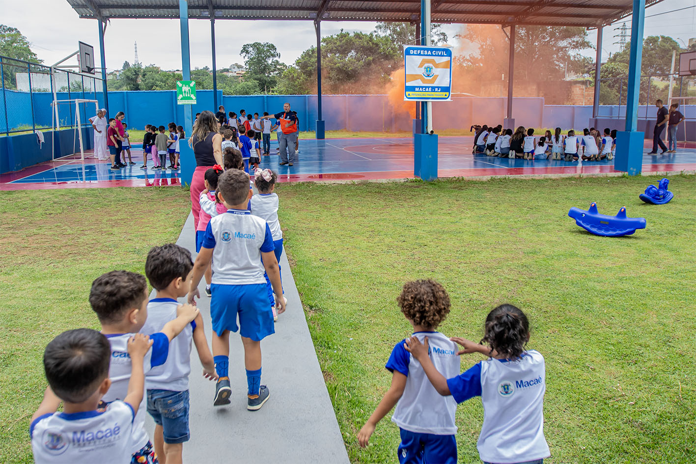 A Defesa Civil de Macaé realizou um simulado de incêndio na Escola Estadual Municipalizada Santa Maria, no Bairro Horto, na manhã desta terça-feira (13). O exercício foi conduzido pela equipe especializada do dia e, após o toque da sirene, em apenas 2,22 minutos todos os alunos, professores, equipes do administrativo e da cozinha da escola estavam na quadra externa, que foi o ponto de fuga informado no treinamento. Primeiro estourou uma fumaça artificial, não química, na cor laranja, sinalizando o local para a evacuação.
