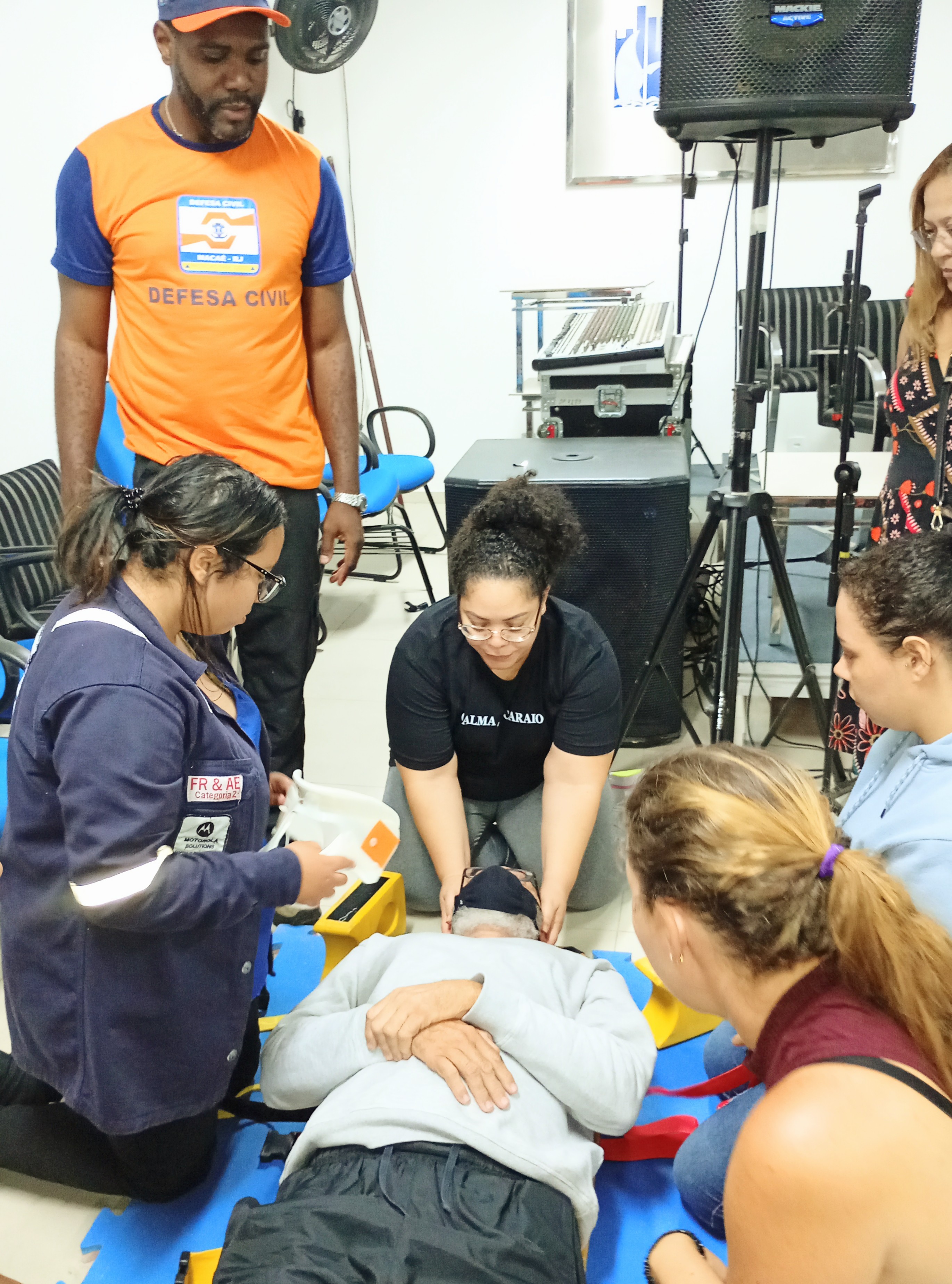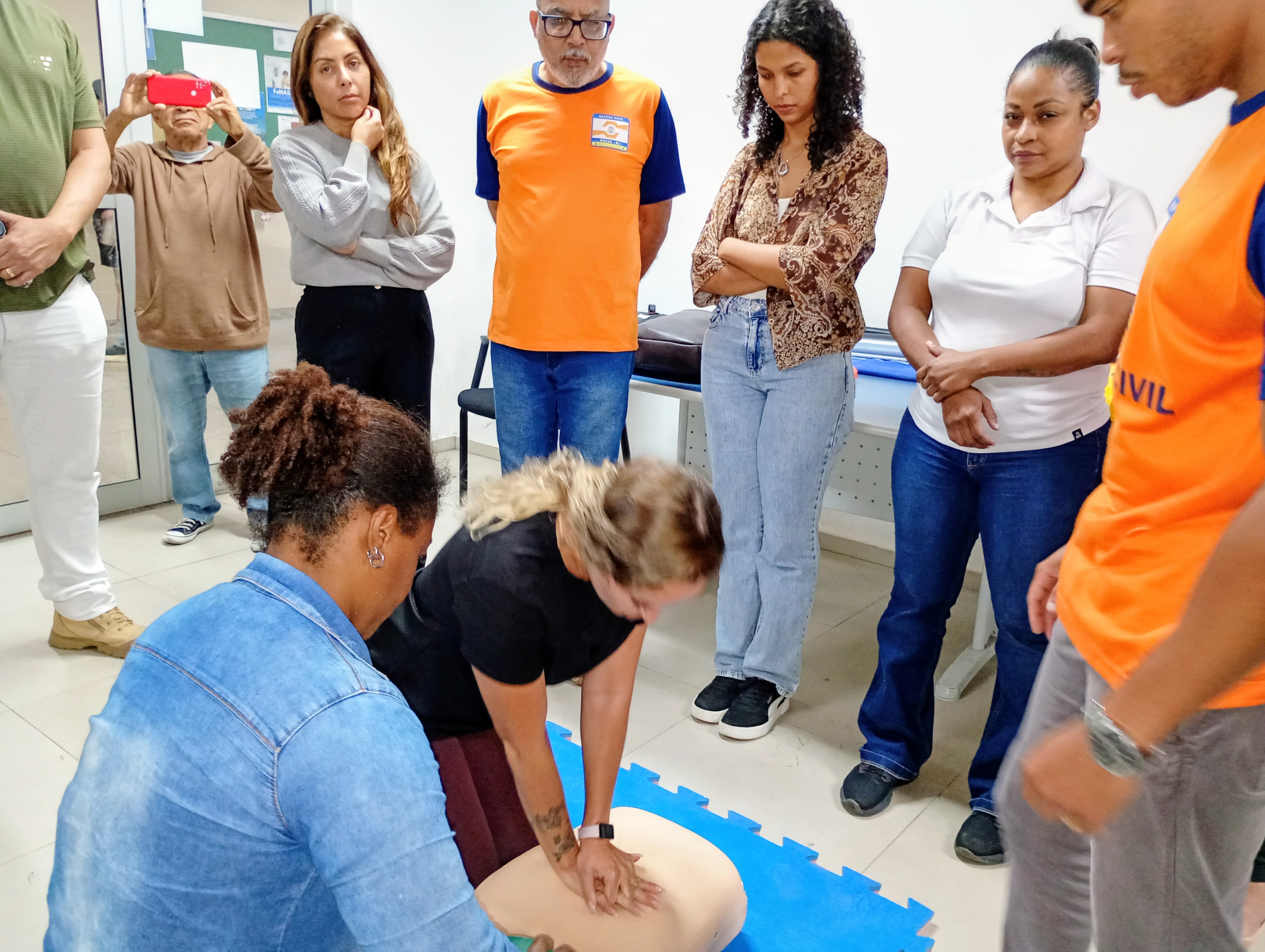 Os participantes do curso de formação de voluntários da Defesa Civil tiveram, nesta quarta-feira (1º), uma aula prática de primeiros socorros na Cidade Universitária. A atividade reuniu alunos que colocaram em prática técnicas essenciais para o atendimento em situações de emergência, como engasgo, desmaio, convulsões, hemorragias e reanimação cardiopulmonar (RCP). A capacitação tem como objetivo preparar os voluntários para atuar de forma rápida e segura em ocorrências do dia a dia ou em grandes desastres.