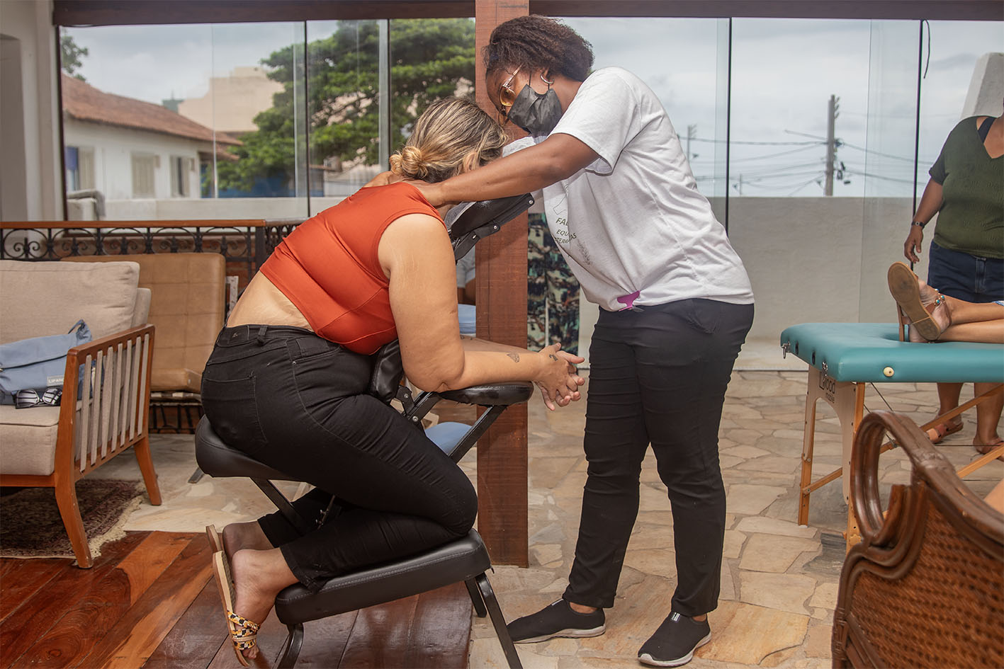 A massoterapeuta que também é artesã, Miriam Pereira, conta que ofereceu a Quick Massage para os artesãos.