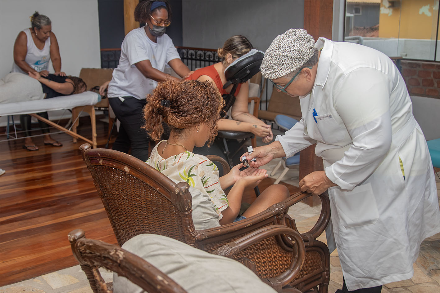 Já a artesã Marina Regis, aproveitou para fazer auriculoterapia, que é uma é uma técnica semelhante à acupuntura, que consiste na aplicação de pressão em pontos específicos da orelha, para auxiliar no tratamento de problemas de saúde como osteoartrite, enxaqueca, lesões musculares e insônia, por exemplo.