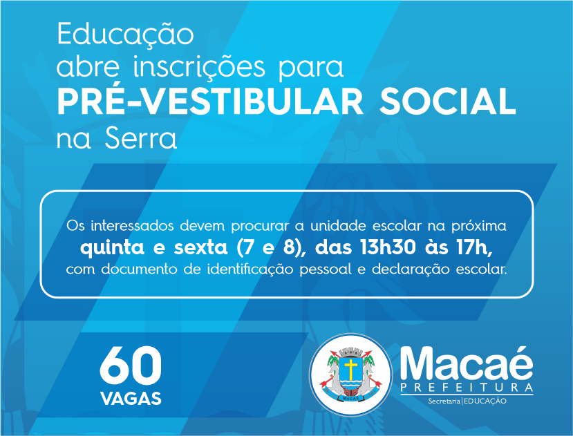 A Secretaria Municipal de Educação está ampliando o programa Pré-Vestibular Social, que agora contará com uma unidade em Trapiche, no Colégio Estadual Municipalizado Carolina Curvello Benjamin, para atender à demanda da região serrana. Os interessados devem procurar a unidade escolar na próxima quinta e sexta (7 e 8), das 13h30 às 17h, com documento de identificação pessoal e declaração escolar. Estão sendo disponibilizadas 60 vagas. As aulas começam dia 2 de maio. Para se inscrever o aluno deverá estar cursando o 3° ano do Ensino Médio, além de ser morador da Serra.