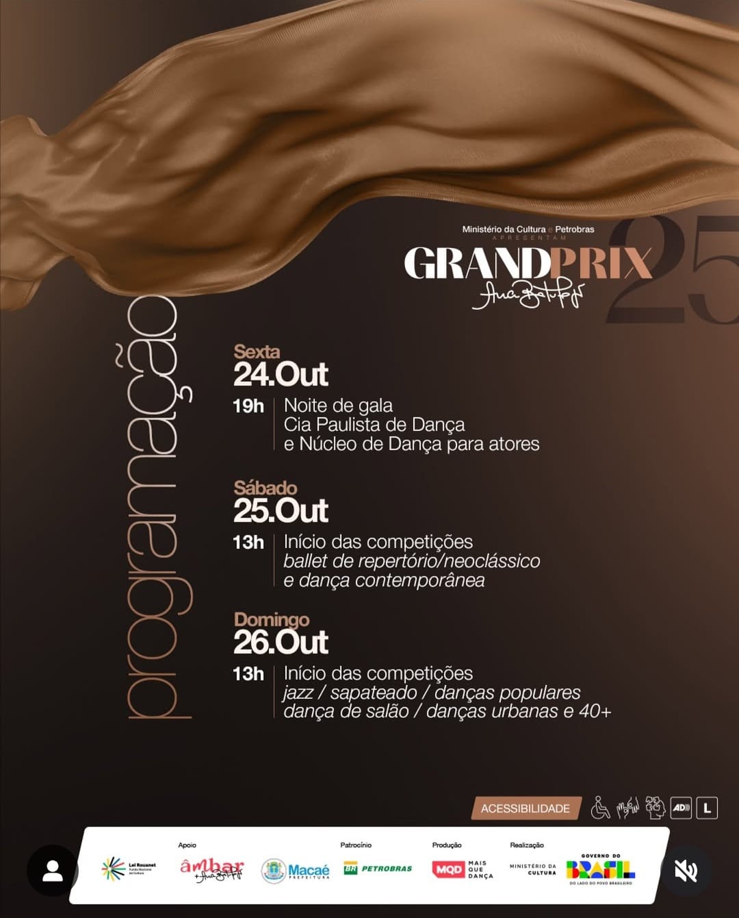 A Escola Municipal de Dança de Macaé (E.M. Dança), vinculada à Secretaria Municipal de Cultura, no sábado (25), participará com mais de 30 alunas em sete coreografias da ‘2ª Edição do Grand Prix Ana Botafogo. O evento será realizado na orla da Praia dos Cavaleiros, em frente à Escola de Dança Ambar + Ana Botafogo. Na sexta-feira (24), a partir das 19h, haverá Noite de Gala. A mostra competitiva ocorrerá no sábado (25), das 13h às 22h e no domingo (26), das 13h às 17h.