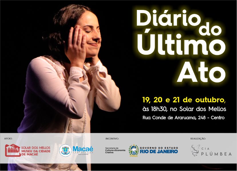 A peça premiada pelo Edital Retomada Cultural 2, um incentivo da Secretaria de Estado de Cultura e Economia Criativa do Rio de Janeiro, ‘Diário do último ato’, será apresentada, com ingressos gratuitos, de quarta-feira (19) a sexta (21), às 18h30, no Solar dos Mellos – Museu da Cidade de Macaé, no Centro da cidade.