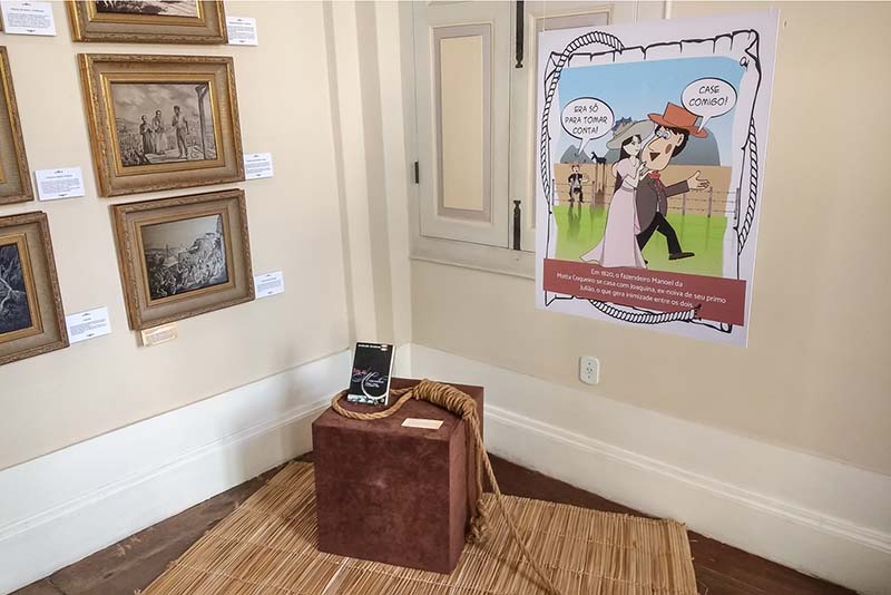 História em quadrinhos, teses, pinturas e livros estão expostos