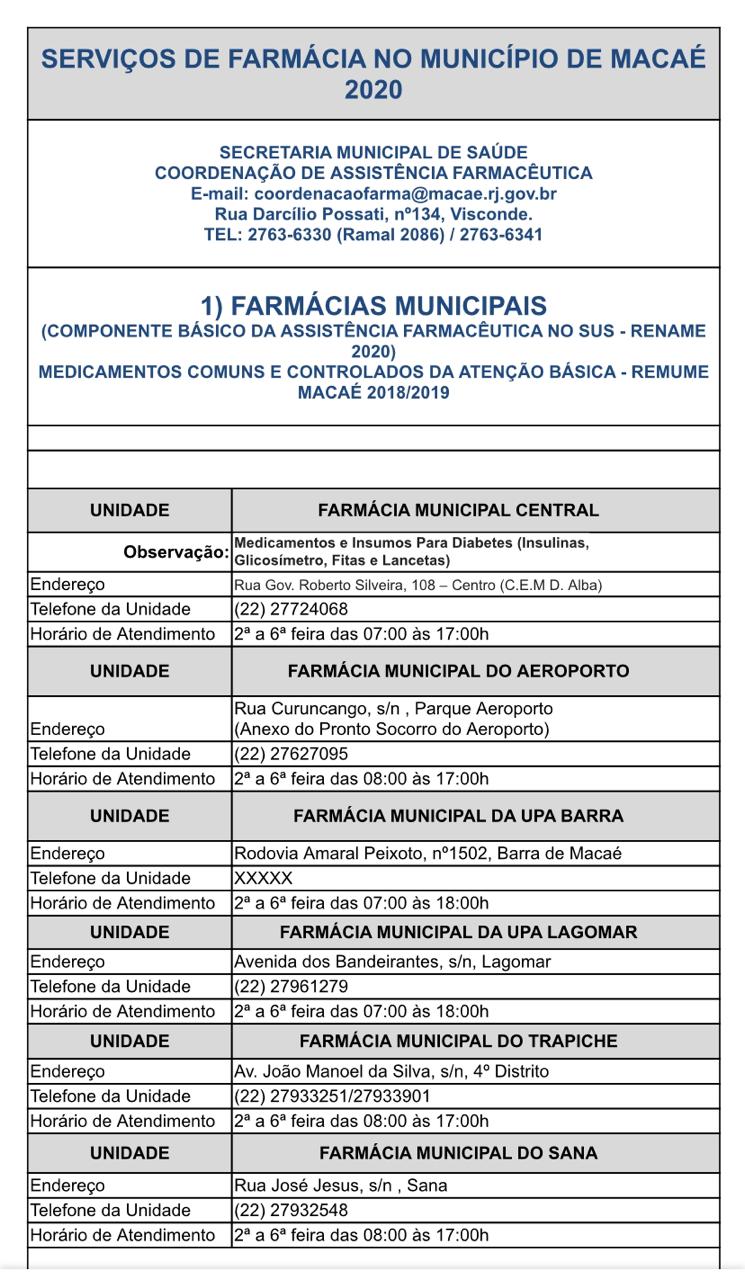 A Prefeitura de Macaé, por meio da Secretaria de Saúde, informa que as farmácias municipais voltarão aos seus horários de atendimento anteriores a pandemia do coronavírus. A partir desta segunda-feira (3), a Farmácia Municipal Central funcionará das 7h às 17h, no Centro de Especialidades Médicas Dona Alba, localizado na Rua Governador Roberto Silveira, 108, Centro. Também retornarão a Farmácia Municipal do Aeroporto, das 8h às 17h; Farmácias das Unidades de Pronto Atendimento (UPAs) Barra e Lagomar, das 7h às 18h; Farmácia Municipal de Trapiche, das 8h às 17h; e Farmácia Municipal do Sana, das 8h às 17h.