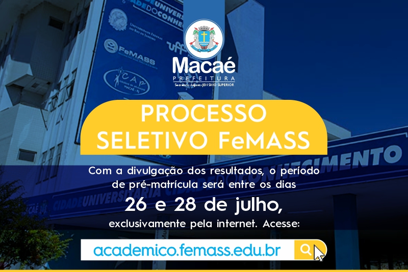 A Faculdade Municipal Miguel Ângelo da Silva Santos (FeMASS), ligada à Secretaria Adjunta de Ensino Superior, divulgou o resultado dos classificados para as vagas do processo seletivo para o 2º semestre de 2021. Os convocados para os cursos de graduação em Administração, Engenharia de Produção e Sistemas de Informação deverão realizar a pré-matrícula por meio digital. A medida segue as restrições relacionadas à pandemia do Coronavírus. O período será de 26 a 28 de julho deste ano, no endereço academico.femass.edu.br, utilizando o número de inscrição como login e senha.