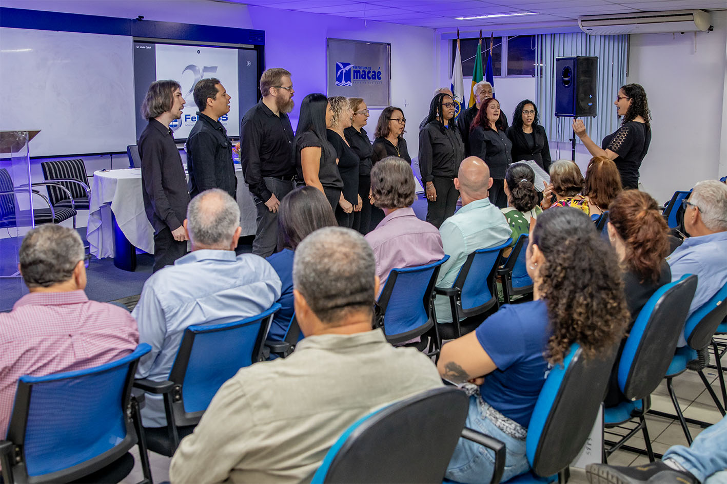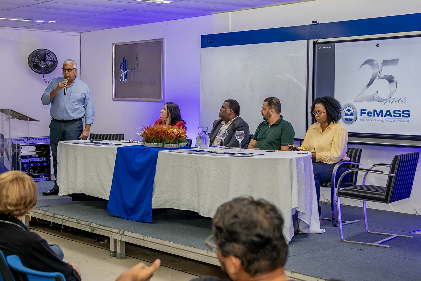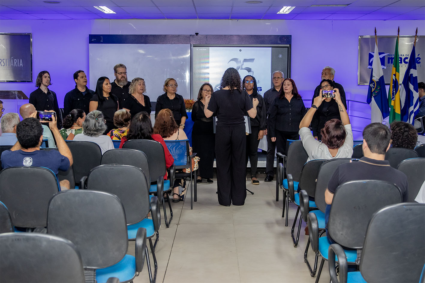 A Faculdade Professor Miguel Ângelo da Silva Santos (FeMASS), realizou na noite desta terça-feira (18), no auditório Cláudio Ulpiano, na Cidade Universitária, uma solenidade para celebrar os 25 anos de existência da instituição. Vinculada à Secretaria Executiva de Ensino Superior da Prefeitura Municipal de Macaé, a faculdade oferece cursos de graduação em Administração, Engenharia de Produção, Sistemas de Informação e Licenciaturas em Letras, Pedagogia e Matemática. Abertura do encontro contou com a apresentação do Coral da Cidade da Escola Municipal de Artes Maria José Guedes (Emart), vinculada à Secretaria de Cultura.