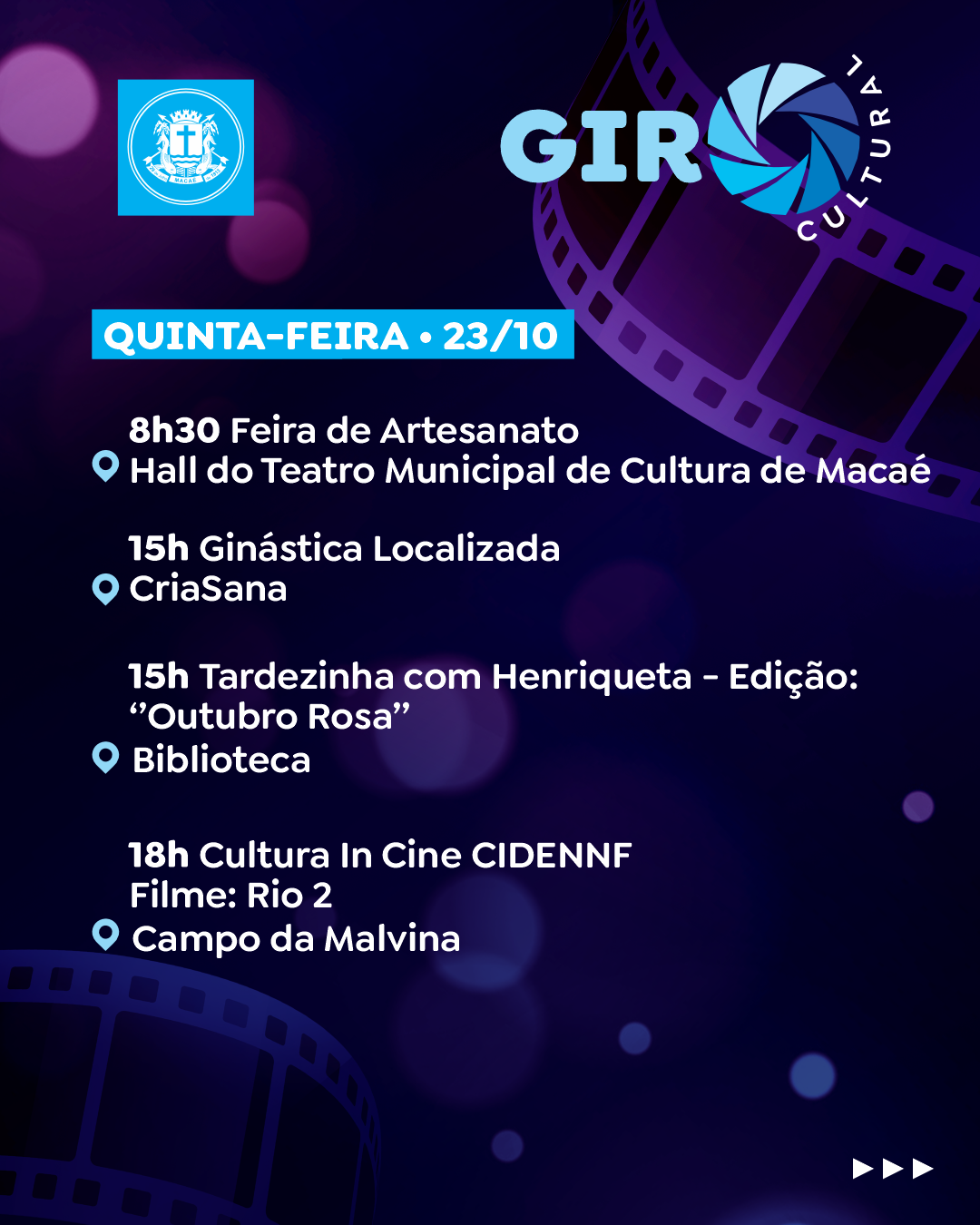 Outros destaques são a Feira de Artesanato no Hall do Teatro Municipal de Cultura de Macaé, aulas de ginástica localizada, no espaço CriaSana, e a tradicional “Tardezinha com Henriqueta”, que nesta edição ganha temática especial do Outubro Rosa, reforçando a importância da prevenção e do autocuidado.