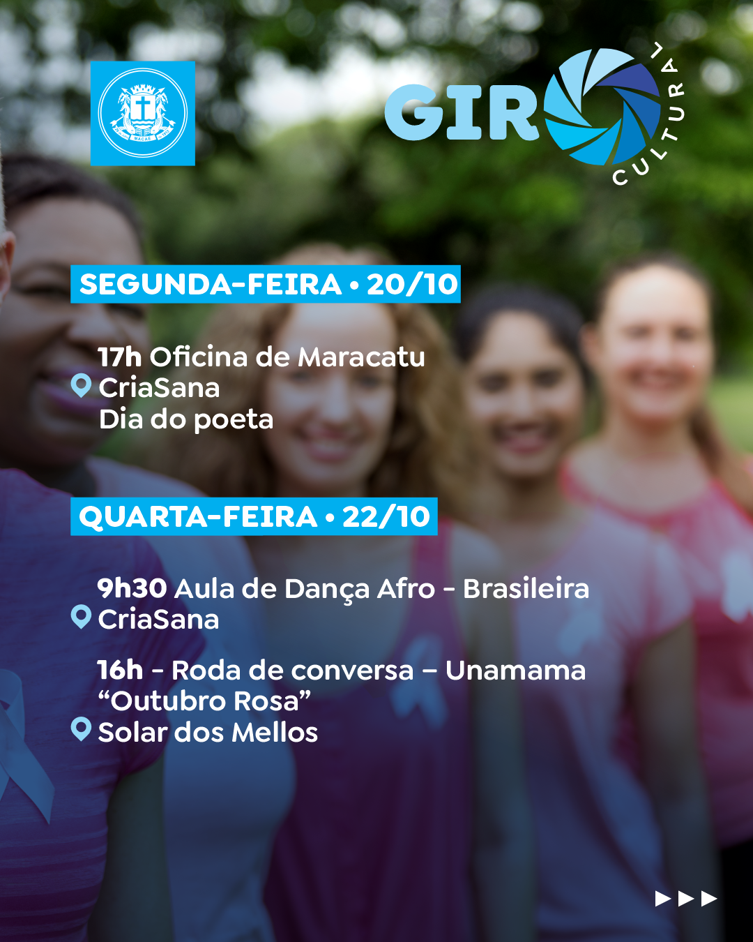 A programação do Giro Cultural, da Secretaria Municipal de Cultura, desta semana, de segunda (20) a domingo (26), promete envolver o público com uma série de atividades gratuitas voltadas à arte, bem-estar e valorização da cultura local. A agenda inclui oficina de maracatu, aula de dança afro, roda de conversa sobre o Outubro Rosa, além de apresentações artísticas, oficinas e sessões de cinema.