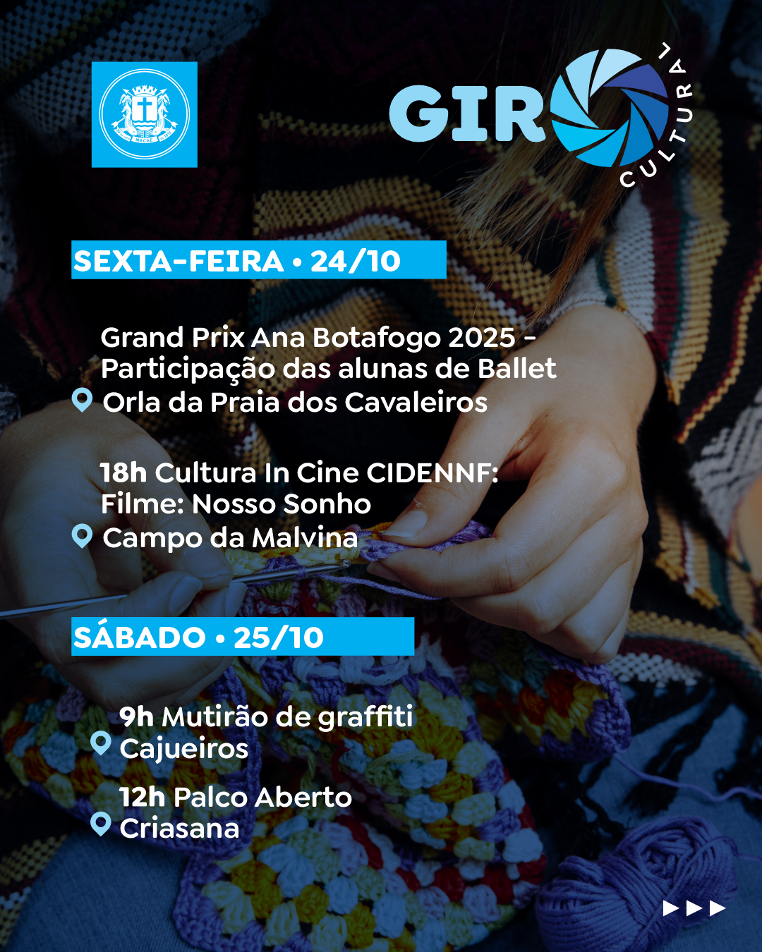 O Giro Cultural também traz o projeto “Cultura In Cine”, com os filmes Rios 2 e Nosso Sonho, nas Malvinas. Outro momento aguardado será o mutirão de grafite nos Cajueiros, reunindo artistas e estudantes em uma ação de arte urbana e cidadania.