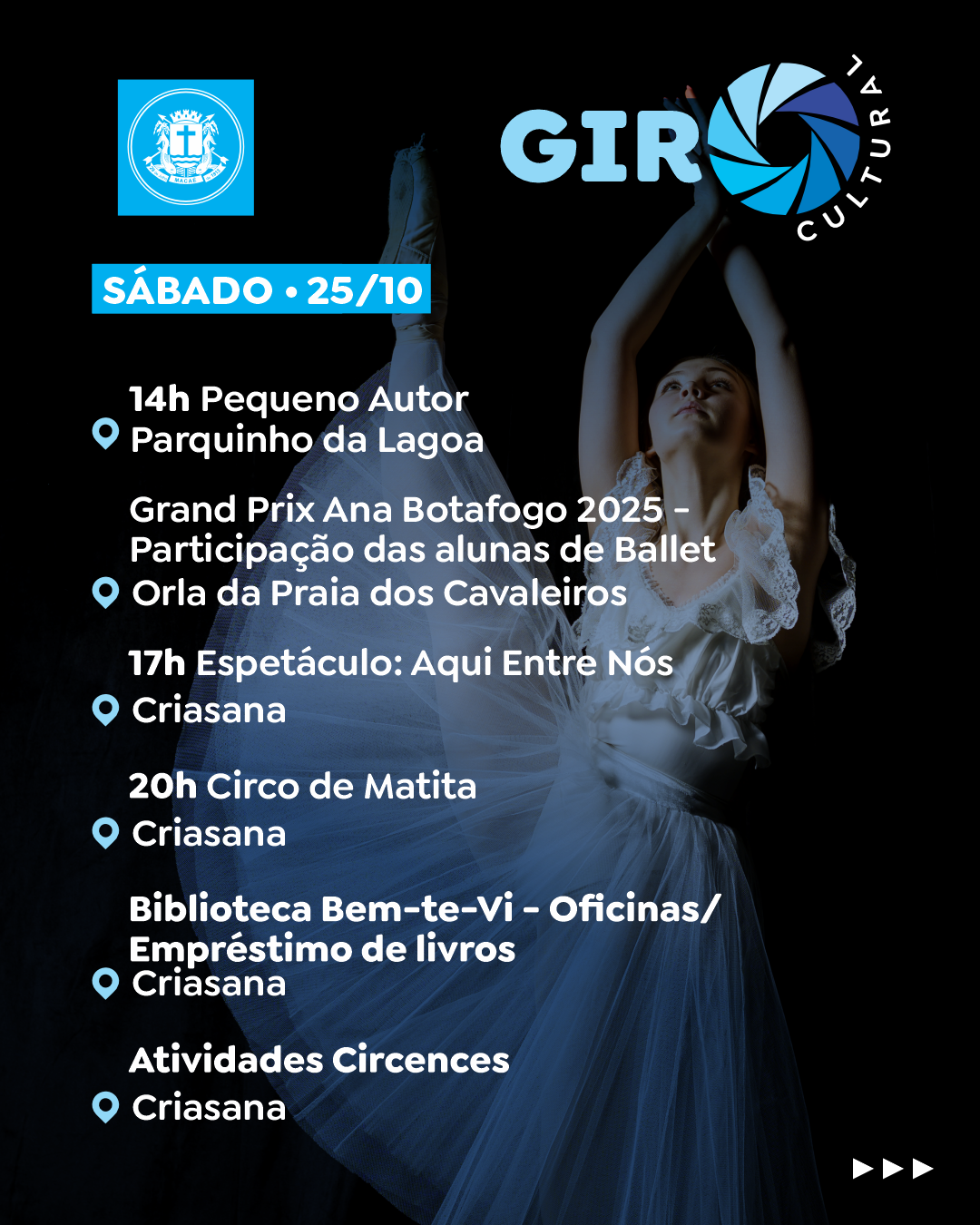 Na orla da Praia dos Cavaleiros, o público poderá acompanhar uma participação especial das alunas de balé, do Grand Prix Ana Botafogo. O projeto “Pequeno Autor” também integra o calendário, com atividades no Parquinho da Lagoa, incentivando a leitura e a produção literária entre as crianças. Já o espetáculo “Aqui Entre Nós”, no espaço CriaSana, promete encantar o público com uma apresentação cheia de sensibilidade e reflexões sobre o cotidiano.
