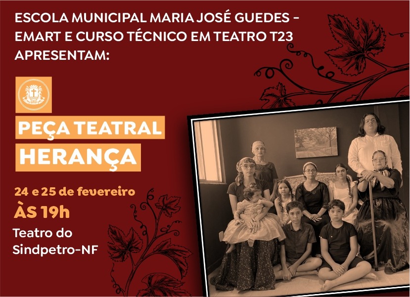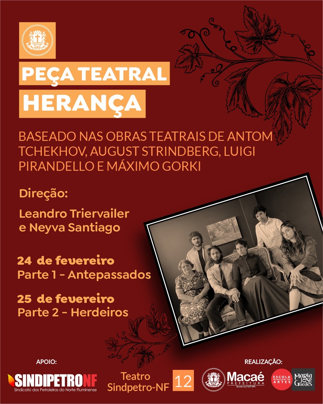 A apresentação “HERANÇA” será realizada nos próximos dias 24 e 25, às 19h, no teatro do Sindipetro-NF. O texto foi baseado nas obras de Anton Tchekhov, August Strindberg, Luigi Pirandello e Máximo Gorki, sendo o resultado da disciplina “Montagem – II”, do curso técnico em Teatro da Escola Municipal de Artes Maria José Guedes (EMART), da Secretaria de Cultura de Macaé.