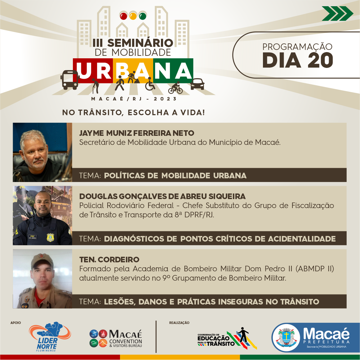 Um assunto que envolve e que tem a ver com todos nós. O trânsito e suas vertentes serão o foco do III Seminário de Mobilidade Urbana que acontece nos dias 20 e 21 (quarta-feira e quinta-feira), na Câmara Municipal. Promovido pela Prefeitura de Macaé, por meio da Coordenadoria de Educação para o Trânsito da Mobilidade Urbana, o seminário vai reunir especialistas e autoridades da área que irão debater e discutir esse tema e outros. O objetivo é trazer assuntos pertinentes à população para a prevenção de acidentes e melhorias no trânsito da cidade.
