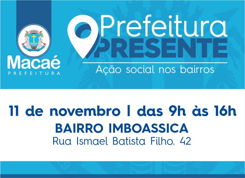 A estrutura do Prefeitura Presente ficará montada em frente ao Posto de Saúde do bairro. Na ocasião, os moradores do Imboassica poderão obter informações sobre como funcionam os serviços oferecidos pela Casa do Empreendedor, do Procon, e locais de acesso à vacinação. Terão ainda orientação sobre encaminhamento para se inscrever em vagas de emprego disponibilizadas pela Secretaria de Trabalho e Renda.