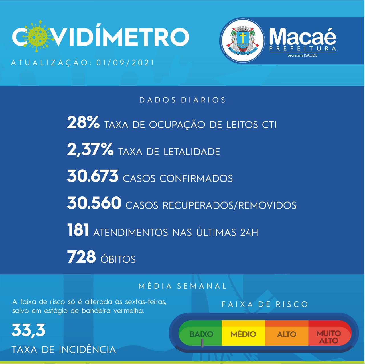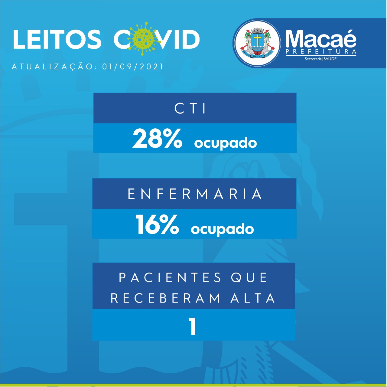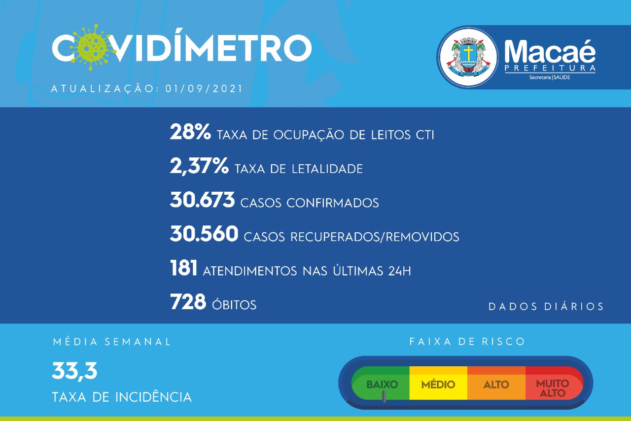 As taxas do município, nesta quarta-feira (01/09), são: 28% de ocupação de leitos de terapia intensiva SUS Covid-19; 16% de ocupação de leitos de enfermaria Covid-19; 2,37% de letalidade e 33,3 de incidência (média semanal).