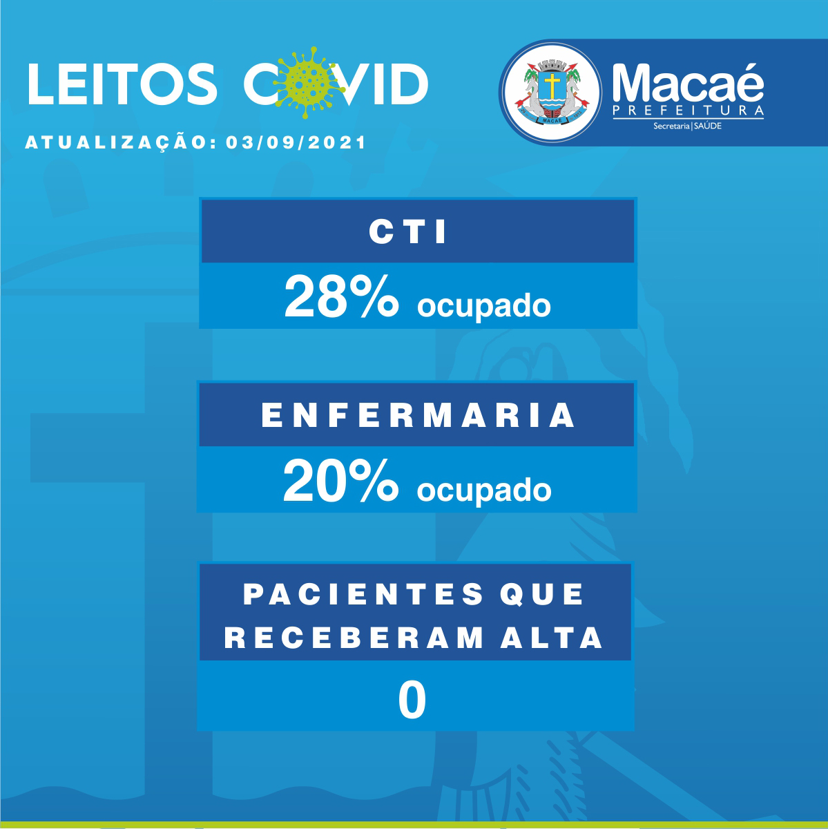 As taxas do município, nesta sexta-feira (03/09), são: 28% de ocupação de leitos de terapia intensiva SUS Covid-19; 20% de ocupação de leitos de enfermaria Covid-19; 2,37% de letalidade e 27,9 de incidência (média semanal).