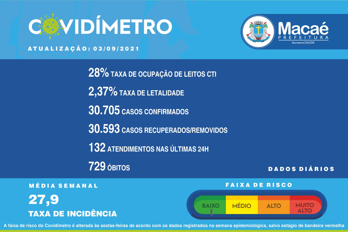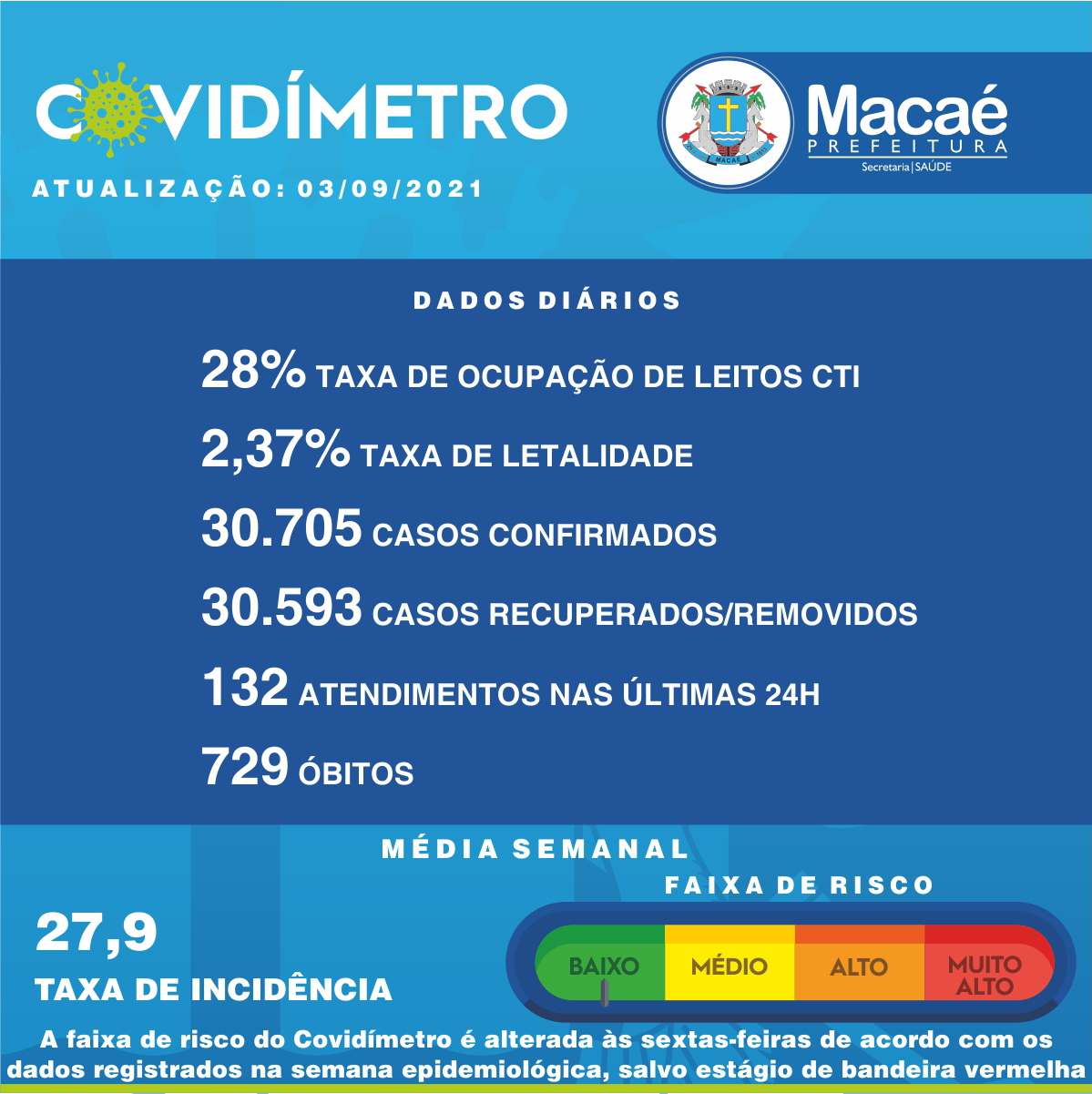 O município registrou um óbito no período: homem, 85 anos, portador de neoplasia. Macaé contabiliza 729 óbitos por Covid-19.