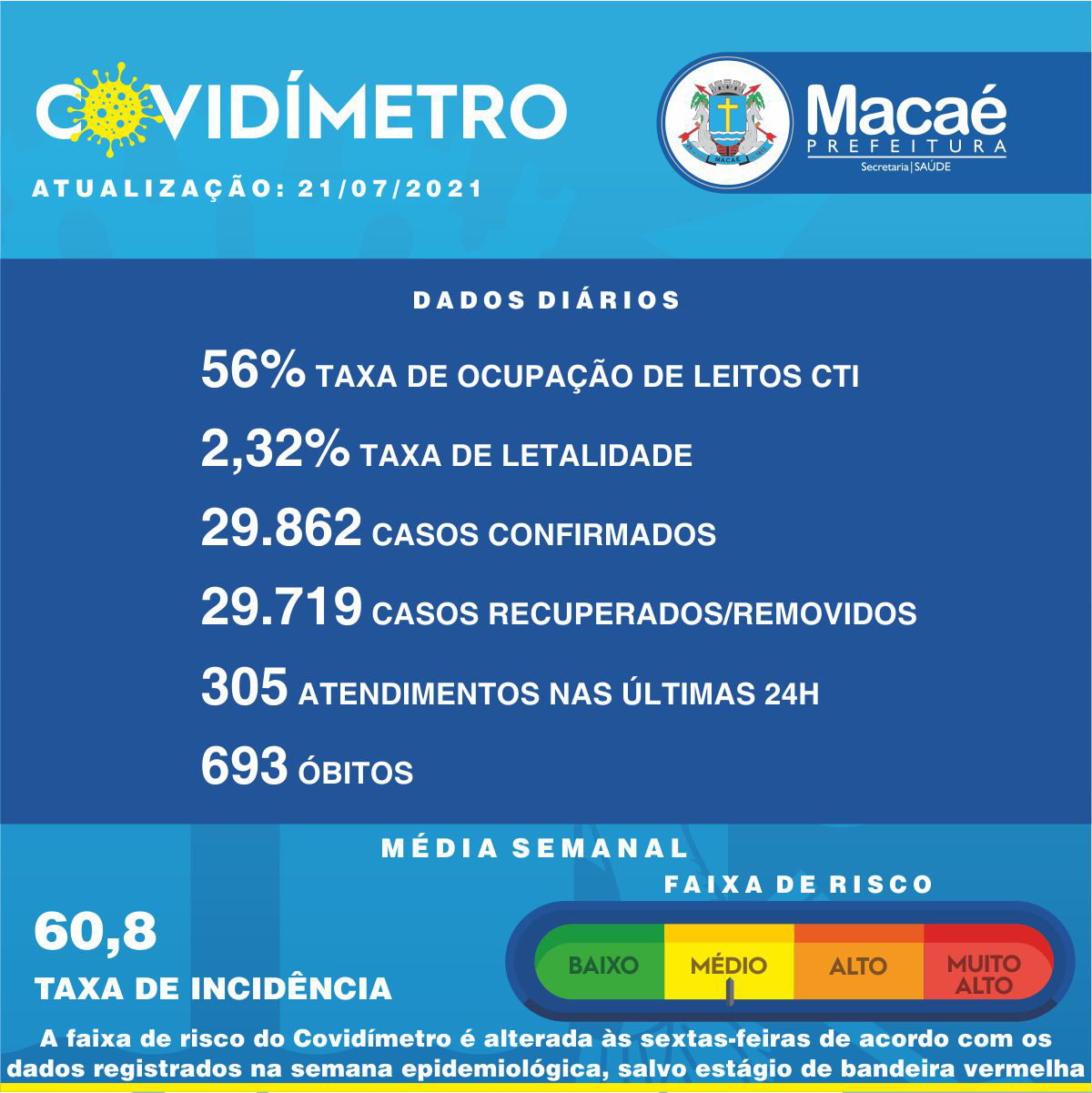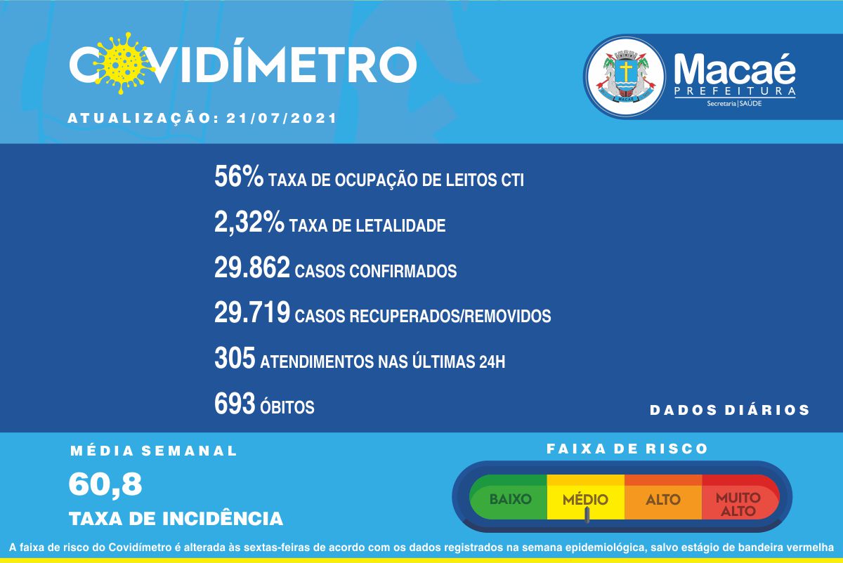 As taxas do município, nesta quarta-feira (21/07), são: 56% de ocupação de leitos de terapia intensiva SUS Covid-19; 40% de ocupação de leitos de enfermaria Covid-19; 2,32% de letalidade e 60,8 de incidência (média semanal).
