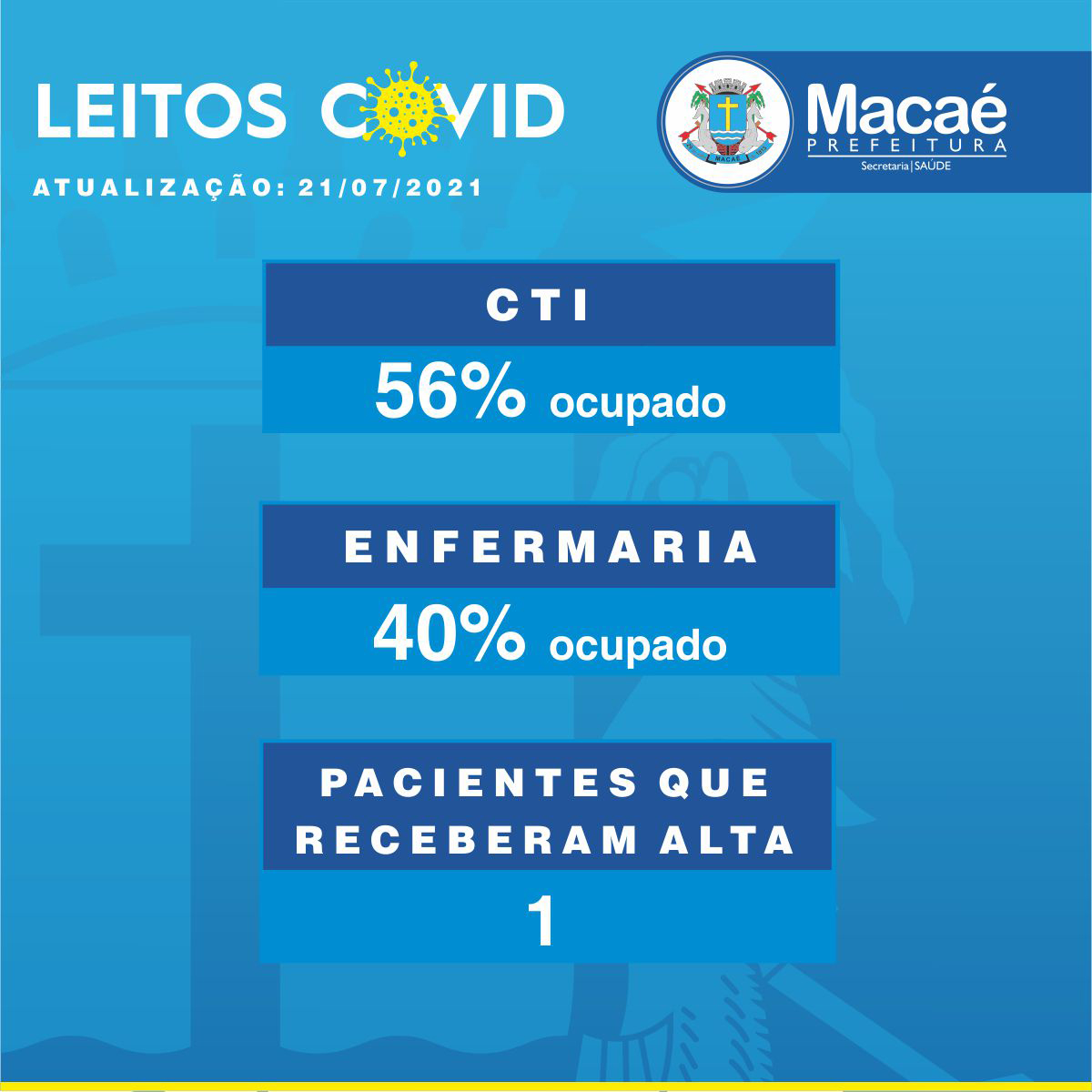 A cidade teve 1 alta e 1 óbito no período: homem de 80 anos, sem comorbidades citadas. Macaé contabiliza 693 óbitos por Covid-19.