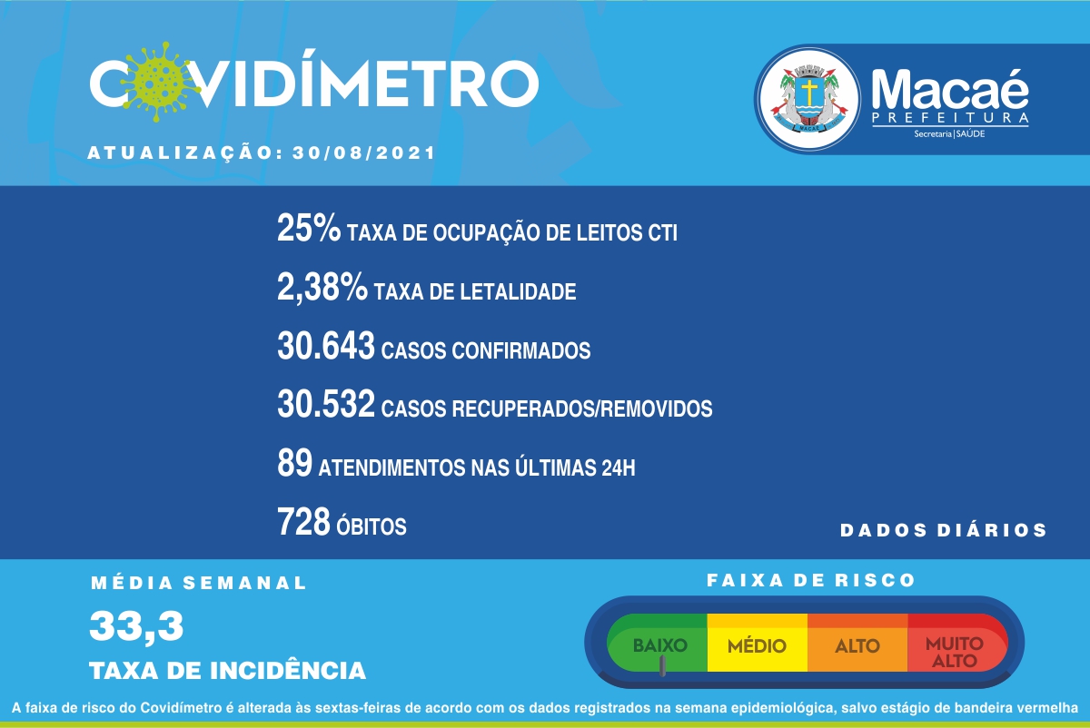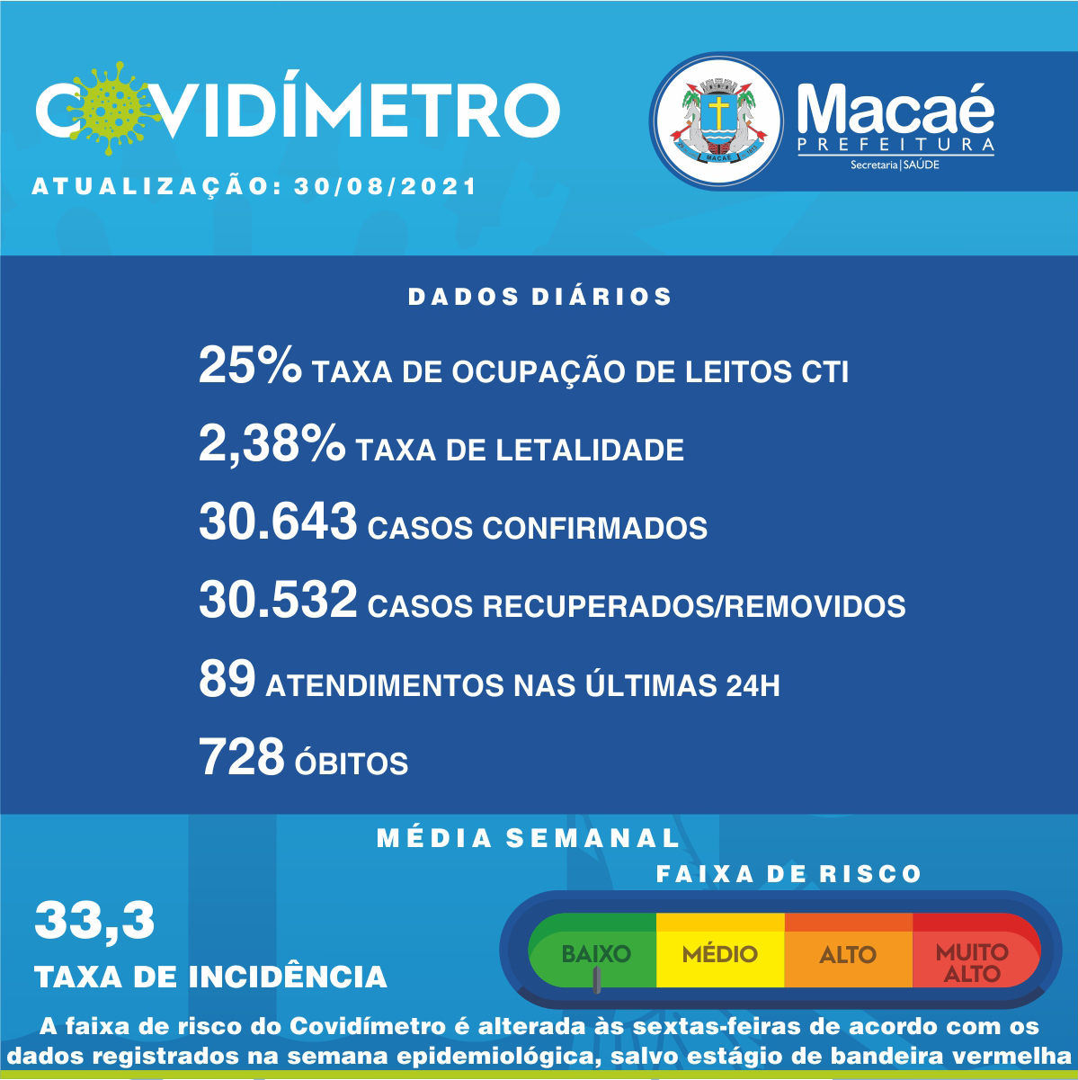 O município registrou três altas no período. Macaé contabiliza 728 óbitos por Covid-19.