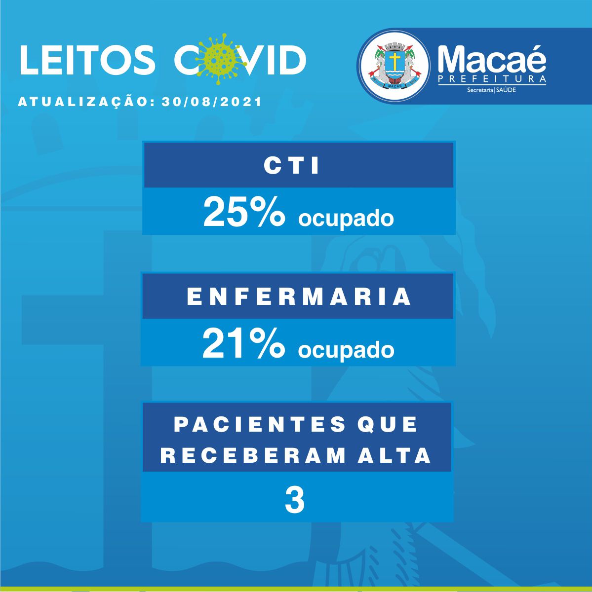 As taxas do município, nesta segunda-feira (30/08), são: 25% de ocupação de leitos de terapia intensiva SUS Covid-19; 21% de ocupação de leitos de enfermaria Covid-19; 2,38% de letalidade e 33,3 de incidência (média semanal).