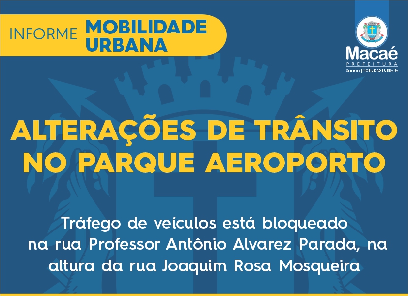 Devido às obras de manutenção da rede de saneamento, o tráfego de veículos na Rua Professor Antônio Alvarez Parada, na altura da Rua Joaquim Rosa Mosqueira, no bairro Parque Aeroporto, está bloqueado. A Coordenadoria de Trânsito da Secretaria de Mobilidade Urbana informa que o acesso será permitido somente para os moradores do local. No período noturno, a via será liberada para todos.