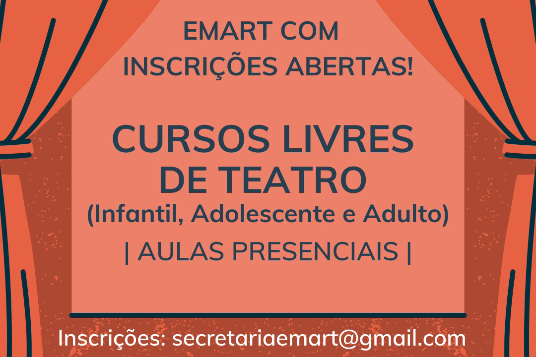 A Escola Municipal de Artes Maria José Guedes (Emart), vinculada à Secretaria de Cultura, está com inscrições abertas para as turmas Infantil, Adolescente e Adulto dos cursos livres de Teatro. O prazo é até segunda-feira (7), por meio do email secretariaemart@gmail.com. São oferecidas 64 vagas.
