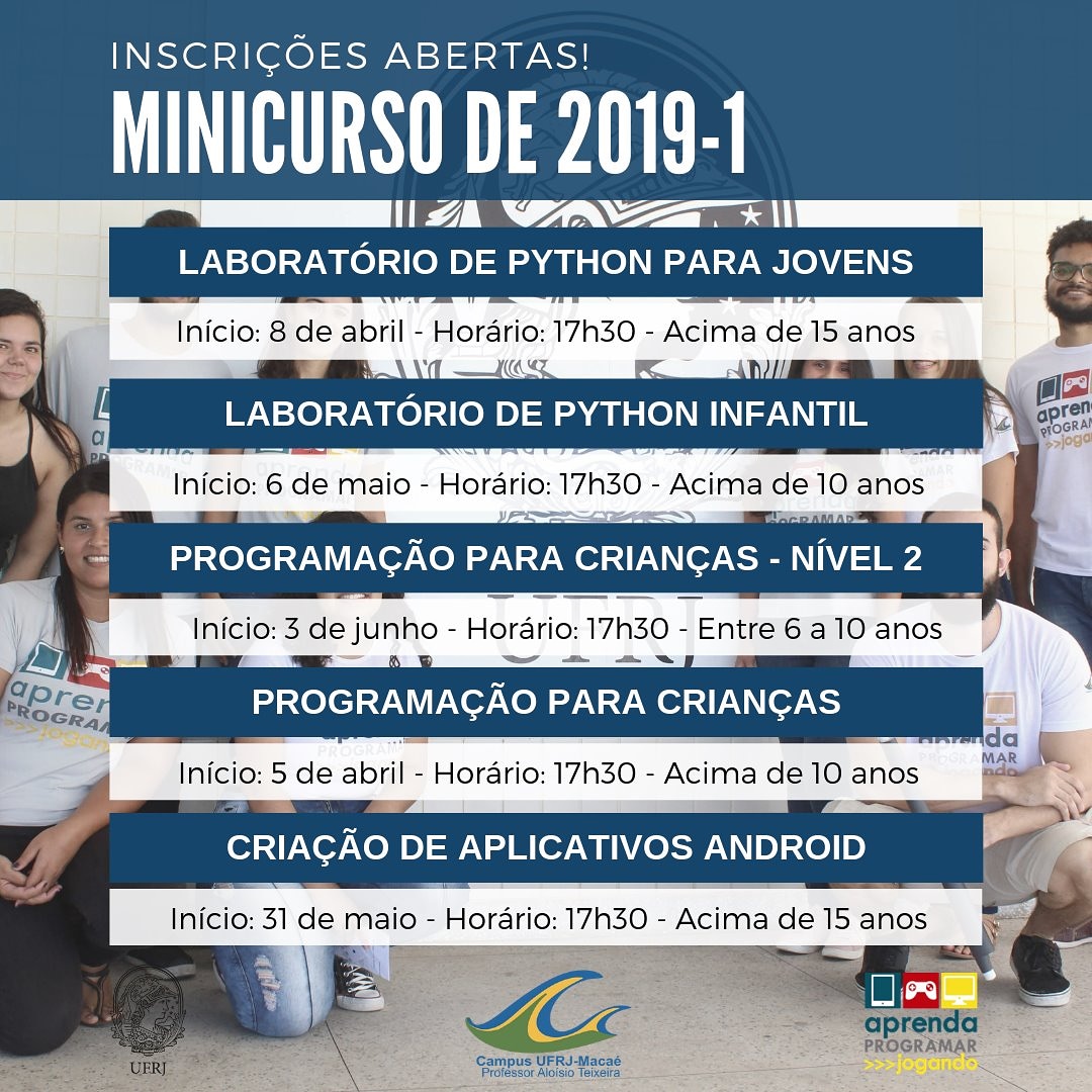 Os cursos serão oferecidos sempre às segundas, quartas e sextas-feiras e são os seguintes: às sextas, Programação para Crianças, com aulas de 5 de abril a 17 de maio e Criação de Aplicativos Android, de 31 de maio a 5 de julho; às segundas e quartas, Laboratório de Python para Jovens, de 8 a 24 de abril, Laboratório de Python para Crianças, de 6 a 22 de maio, e Programação para Crianças nível 2, de 3 a 19 de junho. Todos os cursos são no mesmo horário, sempre das 17h30 às 19h30, e no Laboratório de Informática da Graduação (LIG), Bloco A, do campus. As inscrições podem ser feitas via Facebook ou Instagram: @projetoaprendaprogramar; no site; ou via email: aprendaprogramarufrj@gmail.com.