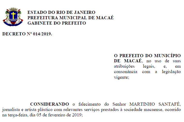 O prefeito de Macaé, Dr. Aluizio, decretou luto oficial de três dias em todo o território do município, pelo falecimento do jornalista e artistas plástico, Martinho Santafé. Durante os três dias, os pavilhões nacional, estadual e municipal, em exibição em Macaé, deverão ser hasteados a meio-mastro em sinal de luto.