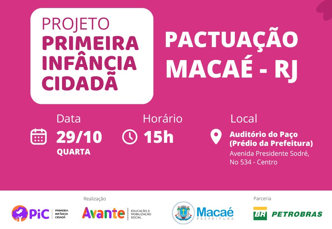 O compromisso de Macaé com o cuidado, a proteção e o desenvolvimento integral das crianças chega a mais uma etapa importante. No dia 29 de outubro, às 15h, será realizada a cerimônia de pactuação da implementação do Plano Municipal pela Primeira Infância (PMPI), no Auditório do Paço Municipal, sede da Prefeitura.