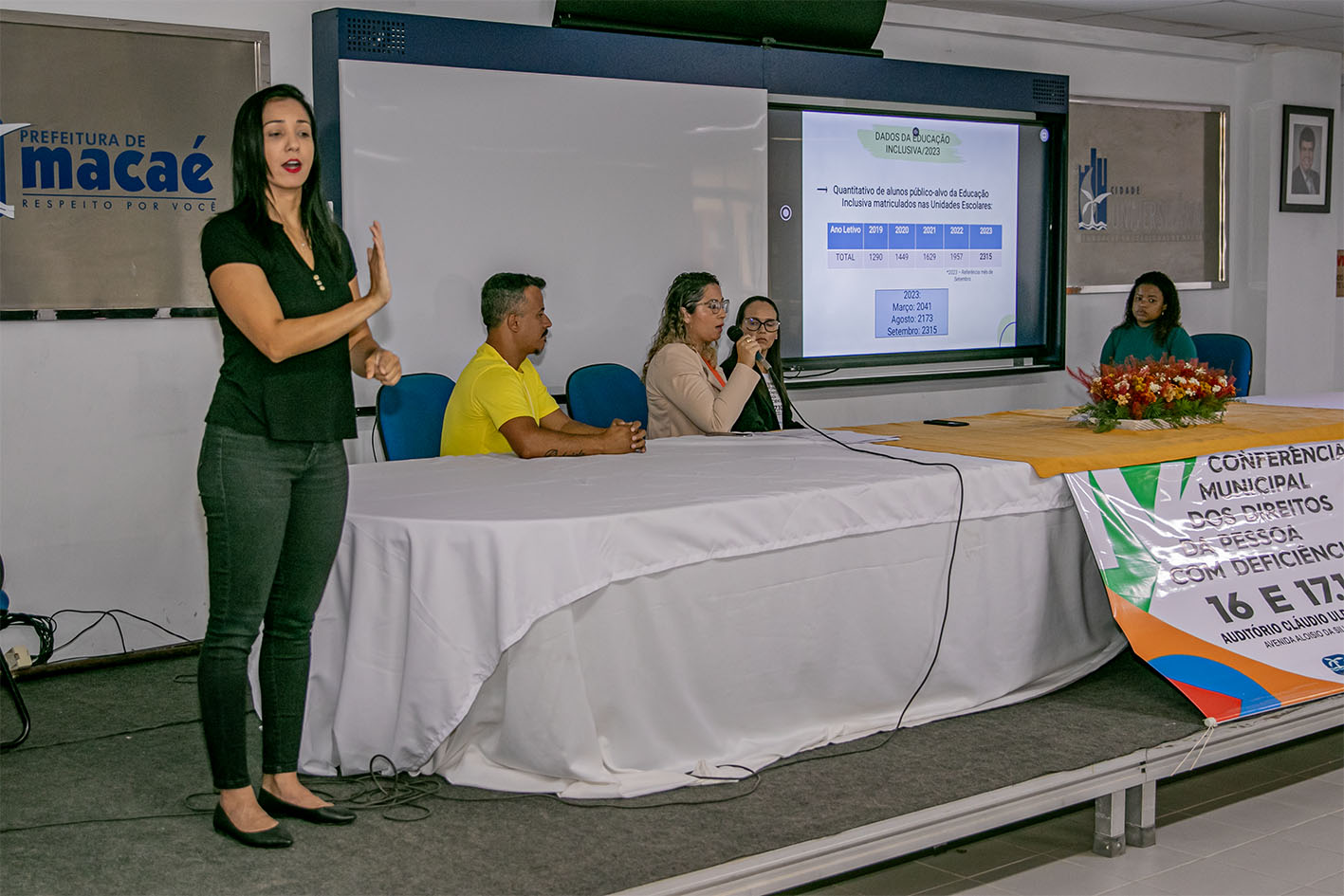 O primeiro tema do dia mostrou os números das políticas públicas de inclusão implementadas no município. O governo municipal ampliou o quantitativo de profissionais trabalhando exclusivamente com alunos PcDs, hoje são 68 salas de recursos funcionando nas escolas da rede pública municipal, entre outras medidas. Os planejamentos não param levando em conta o aumento do número de alunos com deficiência que passou de 2.041 em março deste ano para 2.315, em setembro último.
