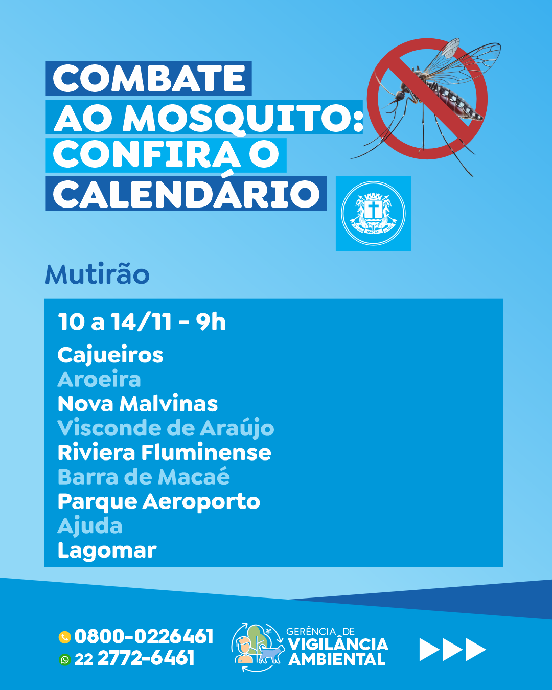 As equipes também estarão empenhadas durante toda semana nos mutirões de combate ao mosquito Aedes, em diferentes áreas da cidade. Entre 10 e 14, as atividades serão realizadas nos bairros Cajueiros, Aroeira, Nova Malvinas, Visconde de Araújo, Riviera Fluminense, Barra de Macaé, Parque Aeroporto, Ajuda e Lagomar, com inspeções, ações educativas e eliminação de criadouros.