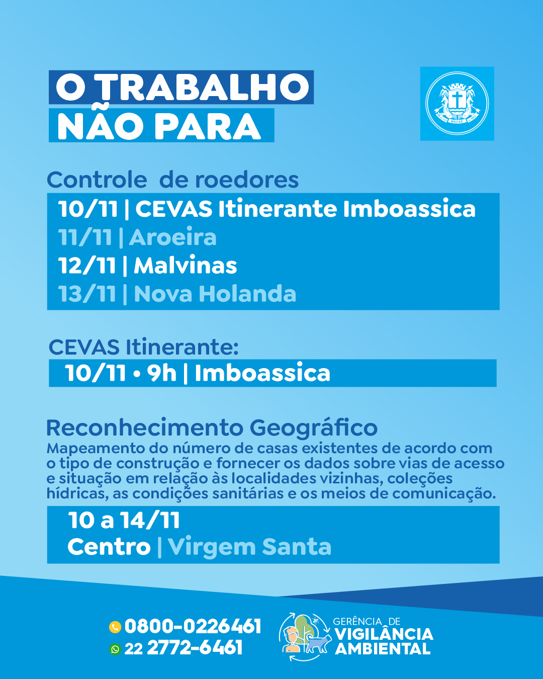 Nesta segunda-feira (10), acontece o Cevas Itinerante no bairro Imboassica, a partir das 9h, oferecendo atendimento direto à população, com orientações sobre prevenção e identificação de possíveis focos do mosquito transmissor da dengue, zika e chikungunya e controle de roedores.