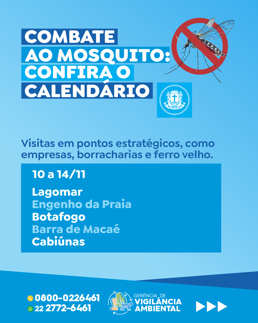 A semana também contará com vistorias em pontos estratégicos, como borracharias, ferros-velhos, empresas e órgãos públicos. As inspeções acontecem nos bairros Lagomar, Engenho da Praia, Botafogo, Barra de Macaé e Cabiúnas, com foco na identificação e controle de possíveis criadouros.