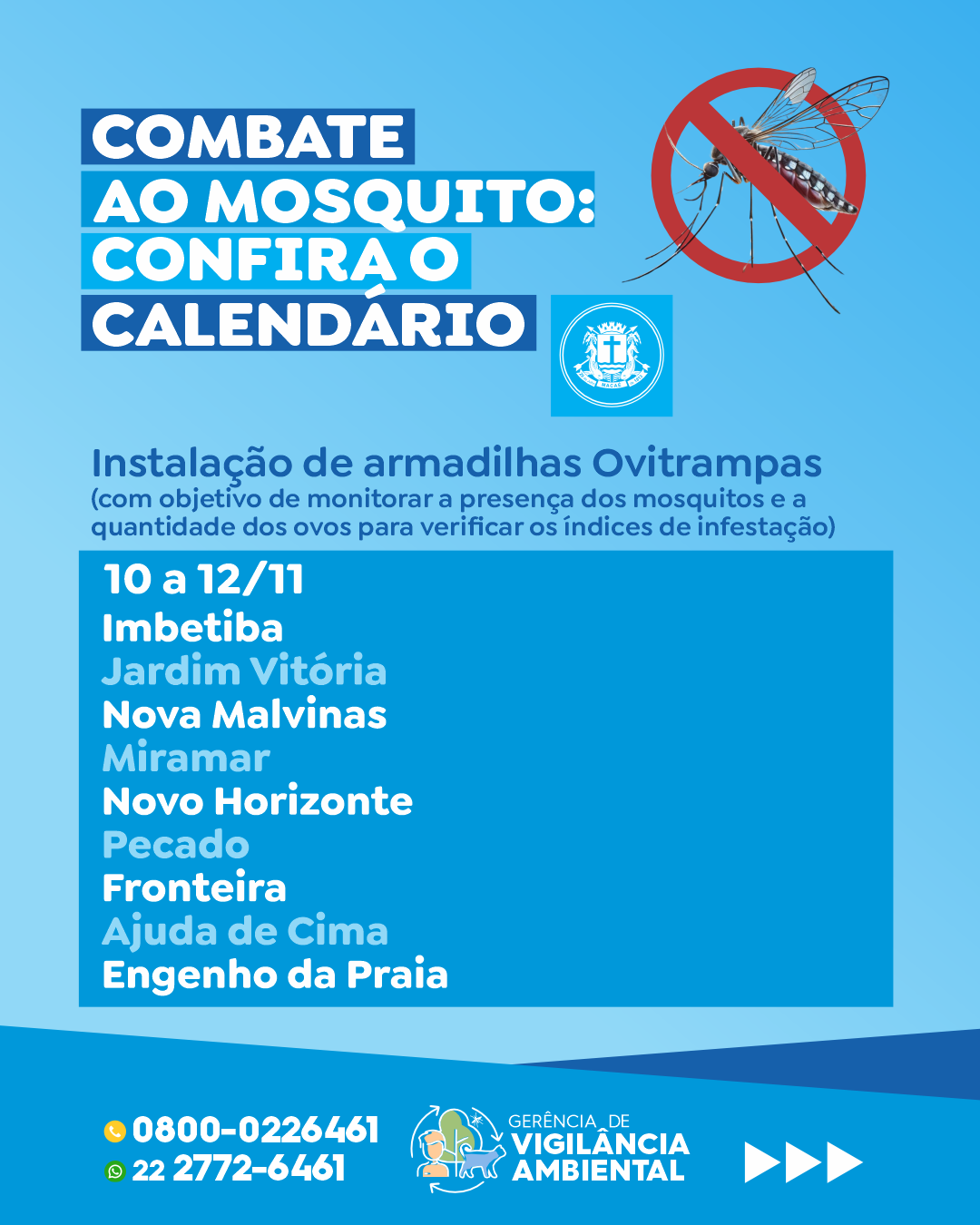 Para reforçar o monitoramento da infestação do mosquito serão instaladas e acompanhadas ovitrampas em nove bairros: Imbetiba, Jardim Vitória, Nova Malvinas, Miramar, Novo Horizonte, Pecado, Fronteira, Ajuda de Cima e Engenho da Praia. O uso do equipamento auxilia na identificação precoce da presença do Aedes aegypti e permite respostas mais rápidas às áreas com maior risco de infestação.