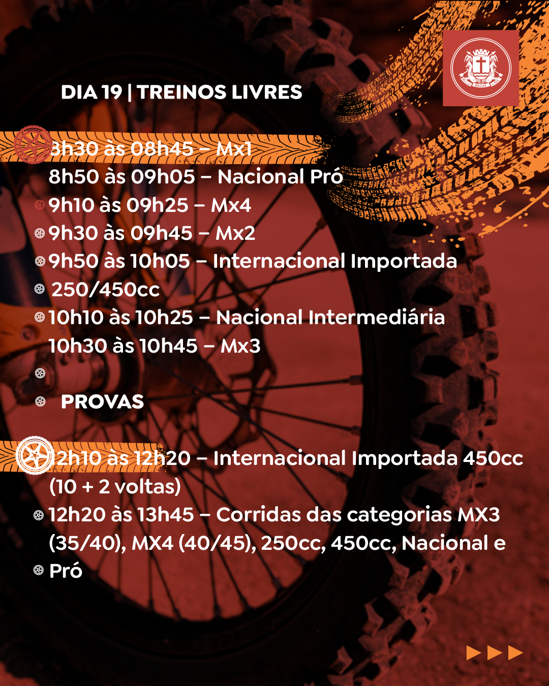 - 12h20 às 13h45 – Corridas das categorias MX3 (35/40), MX4 (40/45), 250cc, 450cc, Nacional e Pró